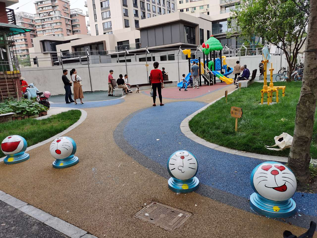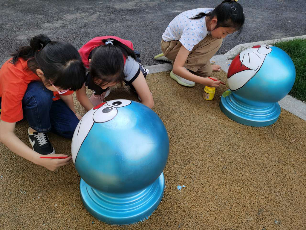 在儿童游乐区,经过营造小队邀请志愿者和社区亲子家庭的努力,原本不起眼的石墩变成了可爱的卡通人物,原本草丛中凸起的井盖被创艺环保的长颈鹿摆件所覆盖,手绘的安全提示牌在路边一字排开,在大家的“头脑风暴”下,这些改造加强了安全警示的作用时也形成了一道童趣可爱的风景线。新颖美观的景观点亮了社区中的这块儿童活动区,也让家长忍不住感叹:“这里一下子变得这么好看了,我家小孩子肯定特别喜欢这里!”