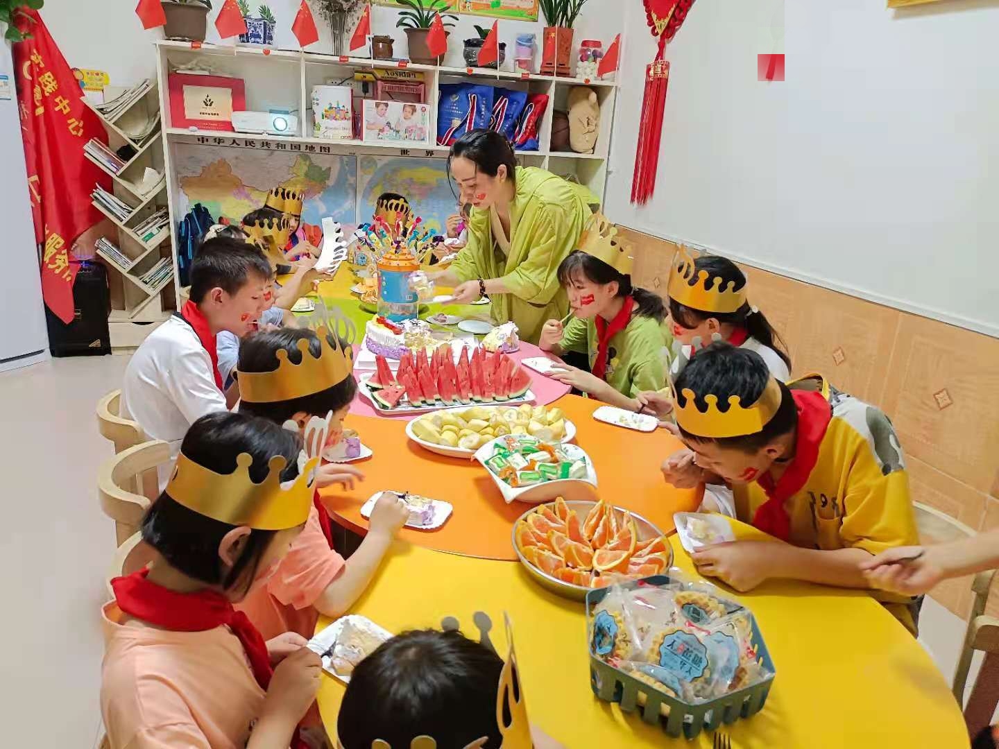 活动中,沐阳托管中心的老师志愿者们将精心准备写有“庆祝建党100周年”的生日蛋糕、水果和零食摆放在毛毛虫课桌上,让每个小朋友带上生日帽,齐唱《我们是共产主义接班人》,为党庆祝100年生日。