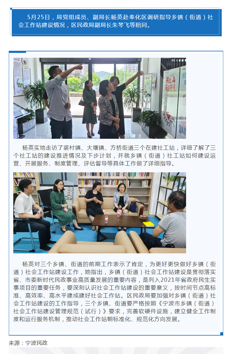 宁波市民政局党组成员、副局长杨英调研指导奉化区乡镇(街道)社会工作站建设情况