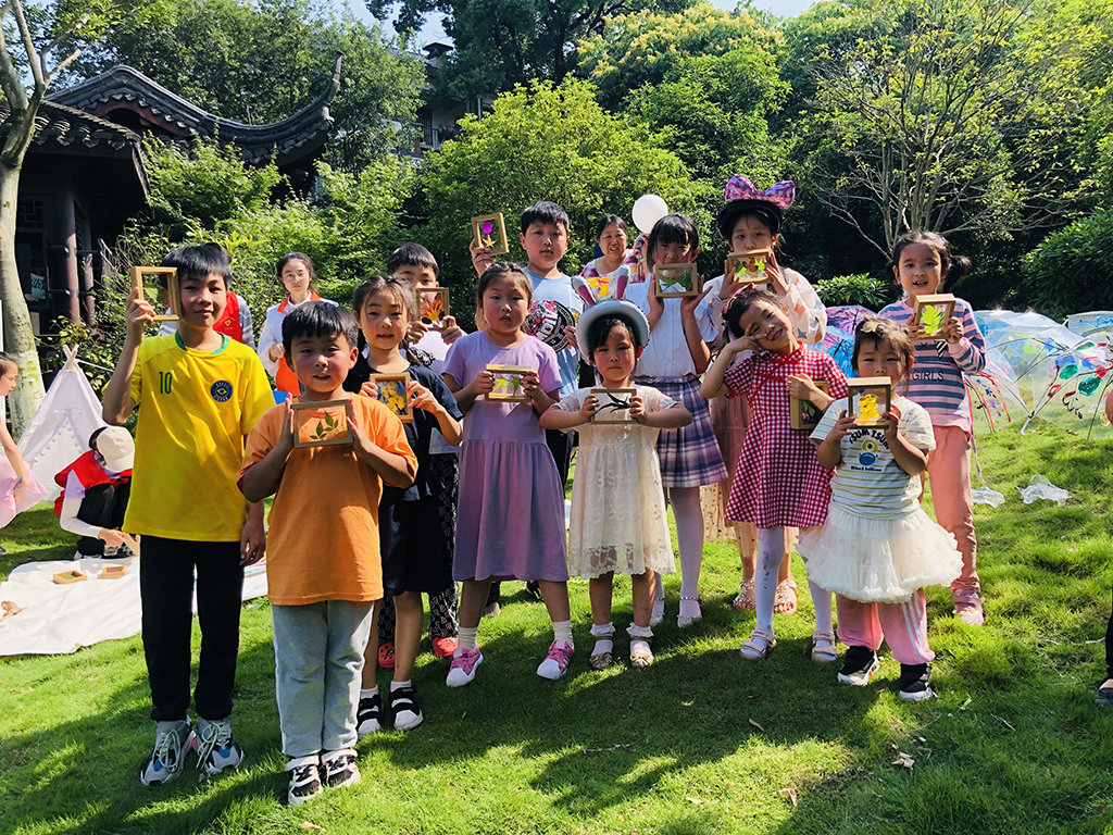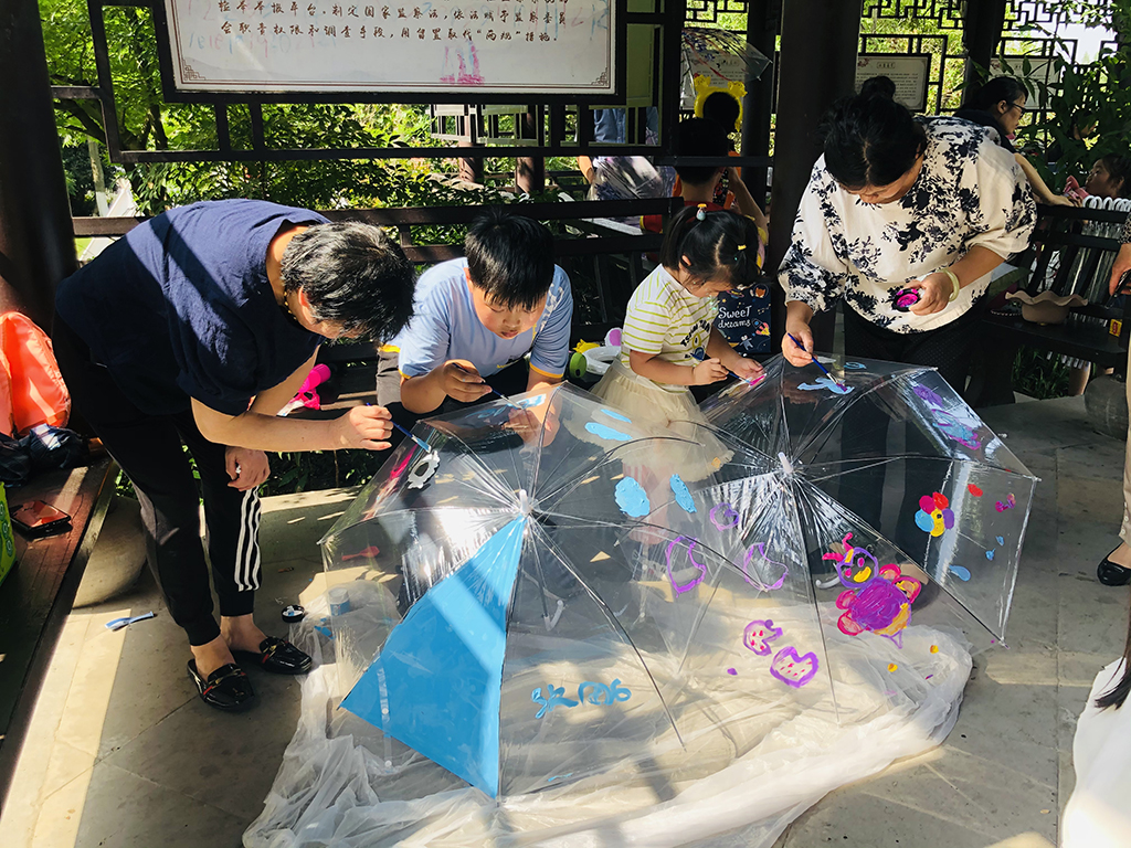 游戏结束后,进入下一个板块“雨伞涂鸦”,小朋友和家长一起使用丙烯颜料和画笔,将夏日的气息绘制在雨伞上,制作一把专属于自己的小花伞,家长和小朋友一起沉浸在涂鸦的乐趣中。雨伞绘制完成后,将雨伞放在阳光下进行展示晾晒,同时进行我们下一个环节“夏日入画”,寻找收集造型美丽的叶子花朵,压制成标本,将夏日印入画框,给这个夏天留下一些新的记忆。