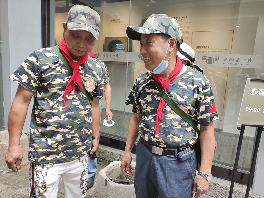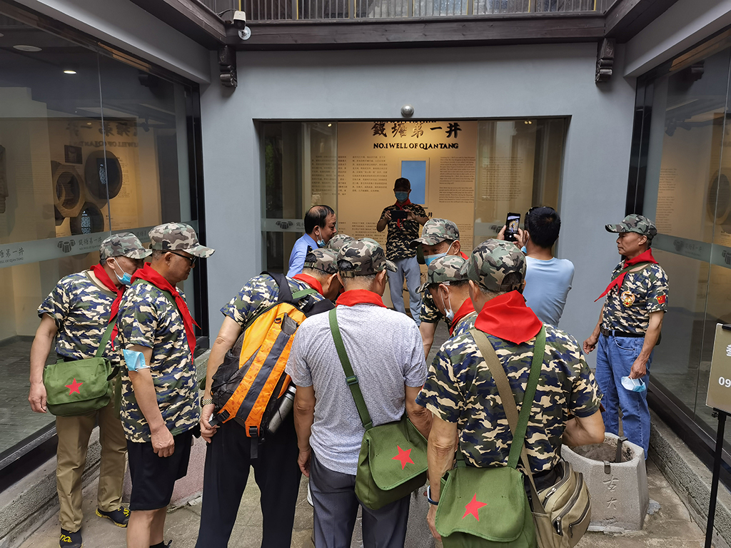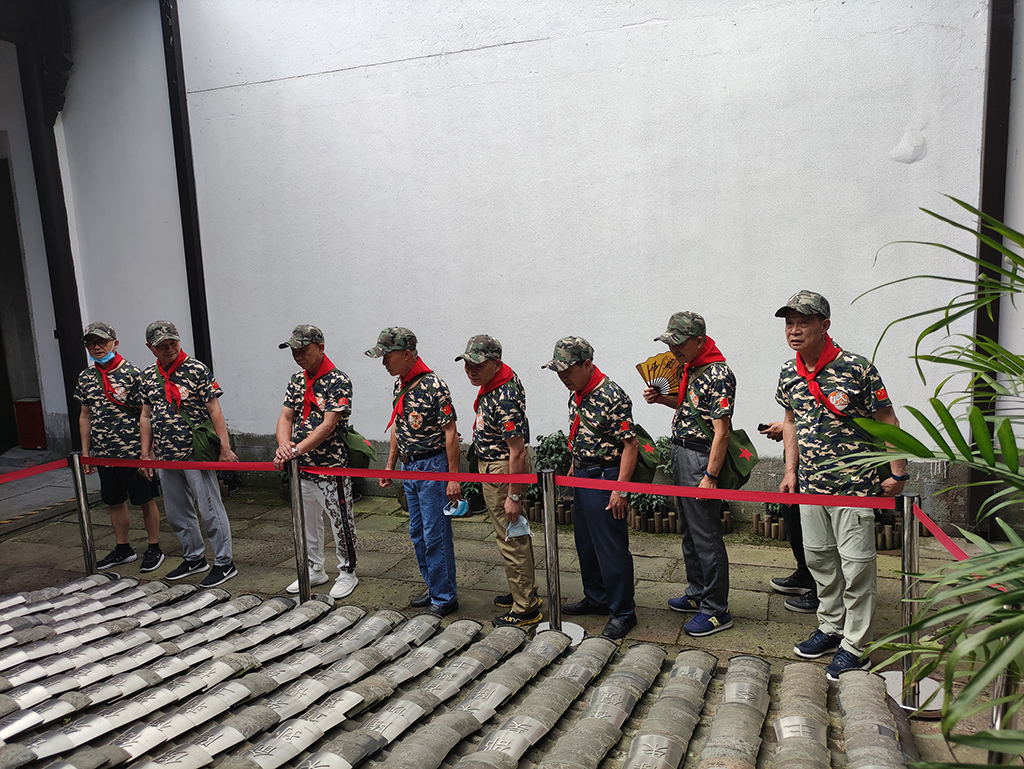 队伍从中国社区建设展示中心出发,参观学习新中国第一个居委会的故事,走过狭长的元宝街,在胡雪岩故居的高墙外与青藤和凌霄花合影。