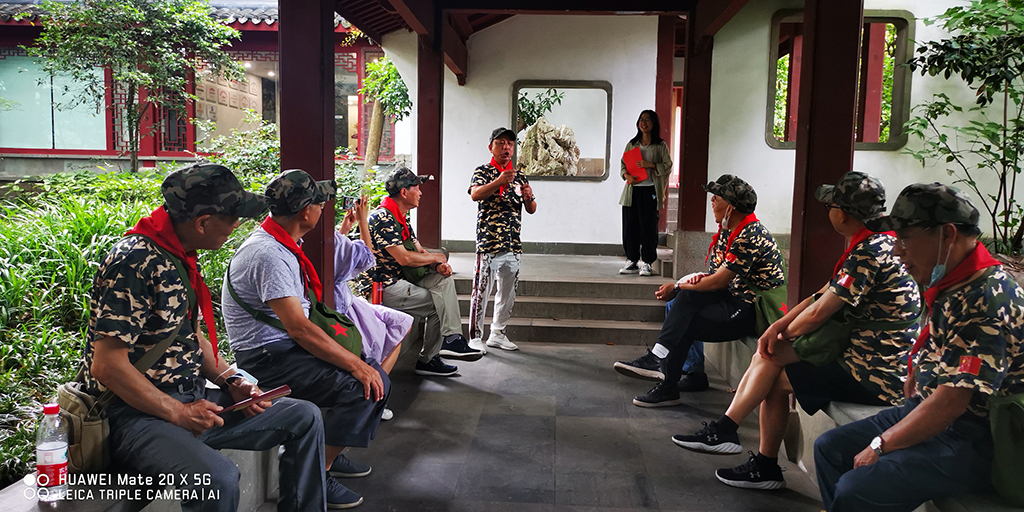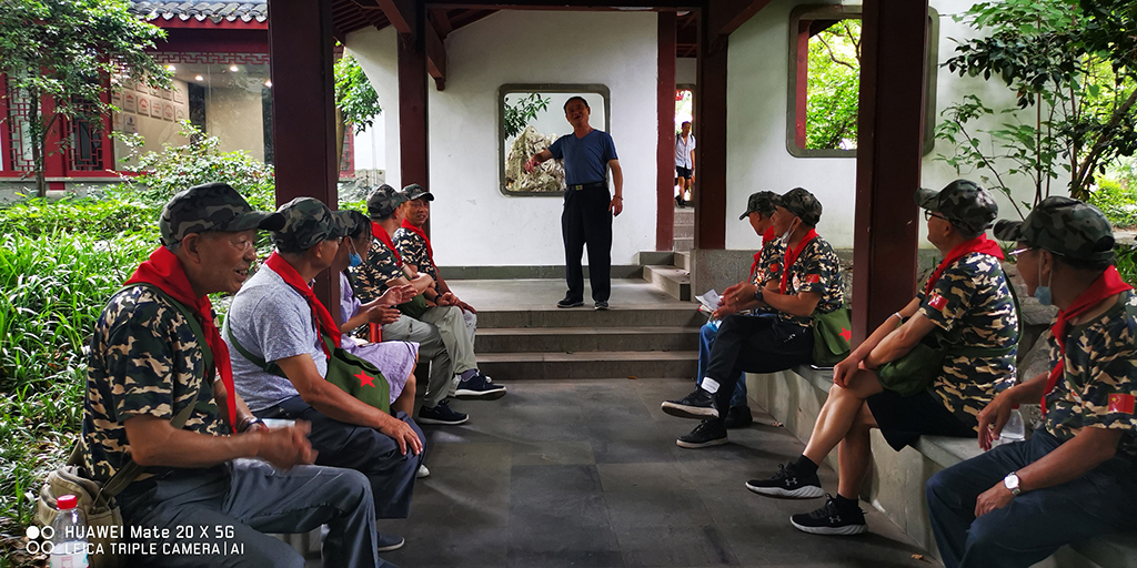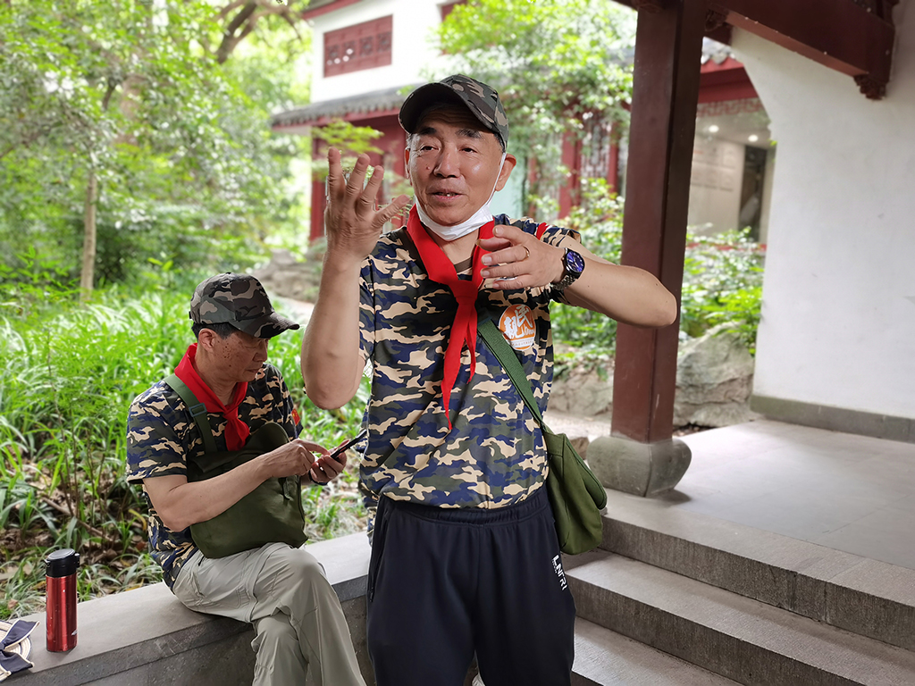 随后在一处廊亭里稍作休憩,分2组进行“心有灵犀”大作战,每组推选1名老兵表演,另外4名组员猜谜,谜底则由另一组成员抽取,负责表演的邵叔叔和马叔叔做起动作来惟妙惟肖,场面一时非常热闹,还吸引了前来游玩的大叔,热情激昂地为大家演唱了一段《咱当兵的人》,洪亮的歌声远远传开,越来越多的游客闻声而来,驻足观望。两组成员猜谜成果不分伯仲,缅怀小组第三节活动在大家的欢声笑语中圆满结束,有老兵戏称自己是“老顽童”,由衷感叹:“生活啊,就是应该这么开开心心!”
