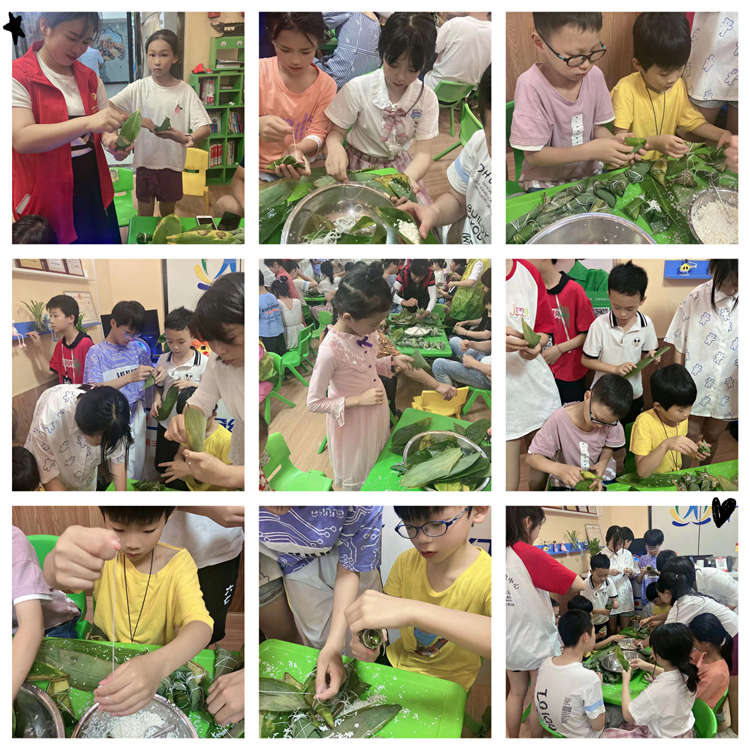 最后活动在捋粽叶,填糯米,经过紧实、封口、扎捆,制作出大小不一的粽子中圆满成功。