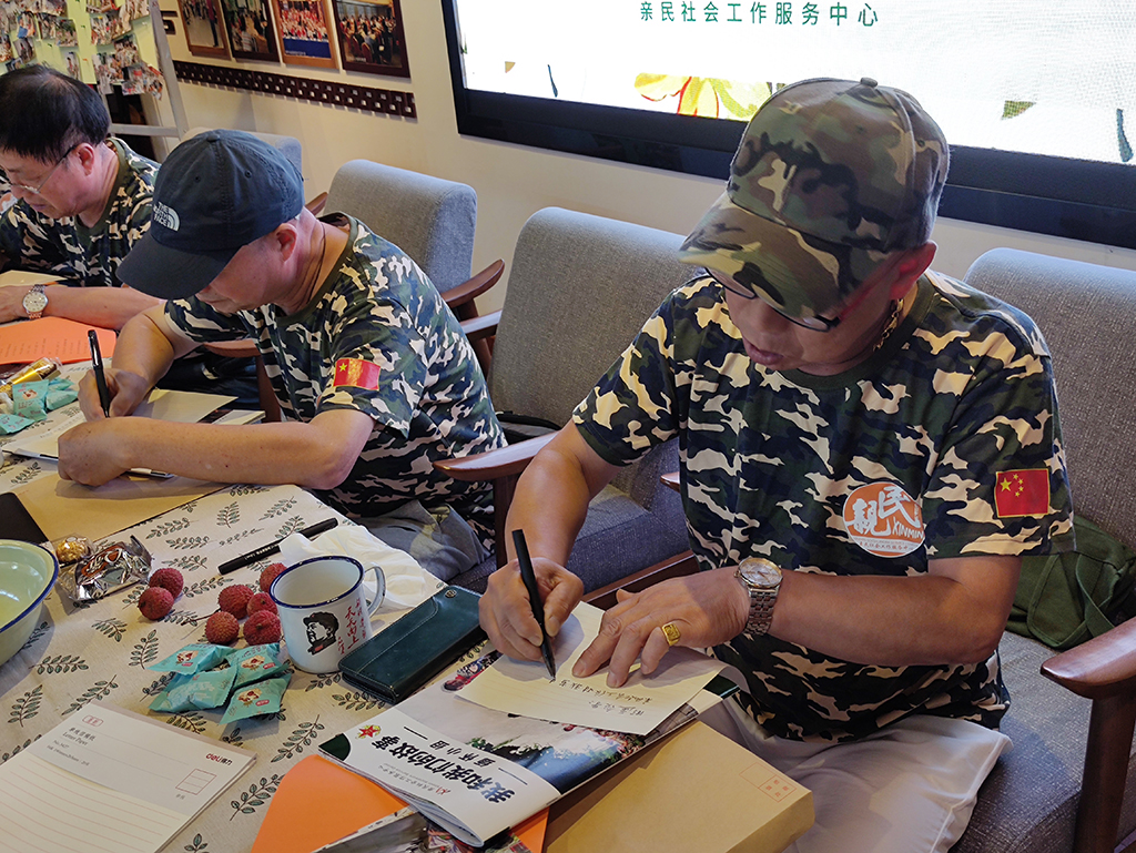 随后,社工将小组历次活动的合照与纪念册分发给每位战友,大家都非常喜欢,互相给战友的纪念册留名,大家还一起合唱了《中国人民解放军军歌》、《歌唱祖国》、《打靶归来》等脍炙人口的红歌,歌声嘹亮,军旅缅怀之情达到高潮。