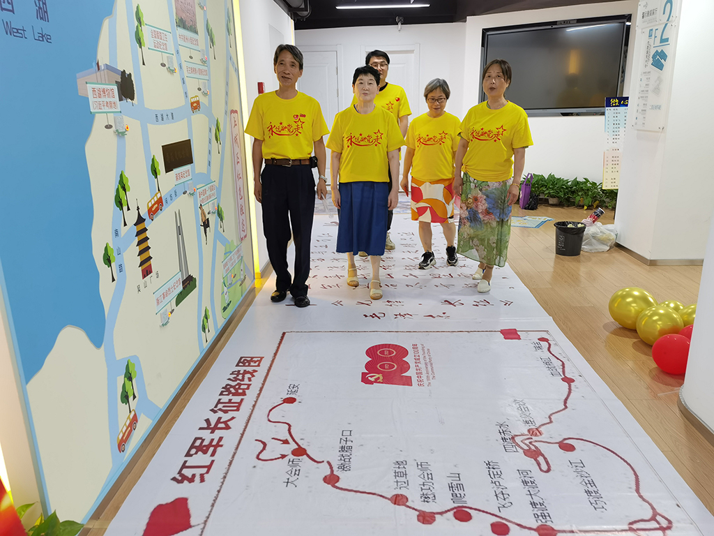 50余名党员身着定制建党短袖,映衬着党旗的那抹光辉,大家用真挚淳朴的文字向党说出了心中的那份炙热与祝福。党员们行走在长征画布上,重温了红军长征艰苦卓绝的光荣历史,缅怀革命先辈的光辉足迹。
