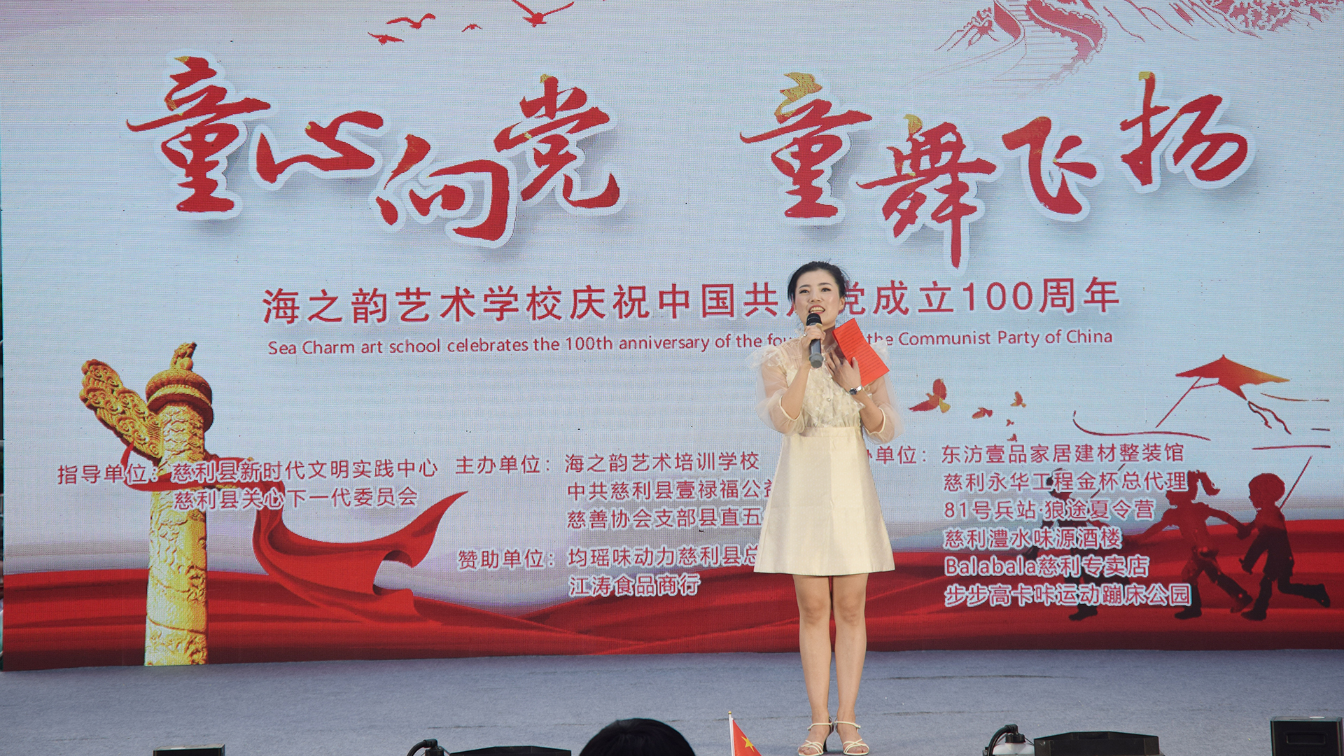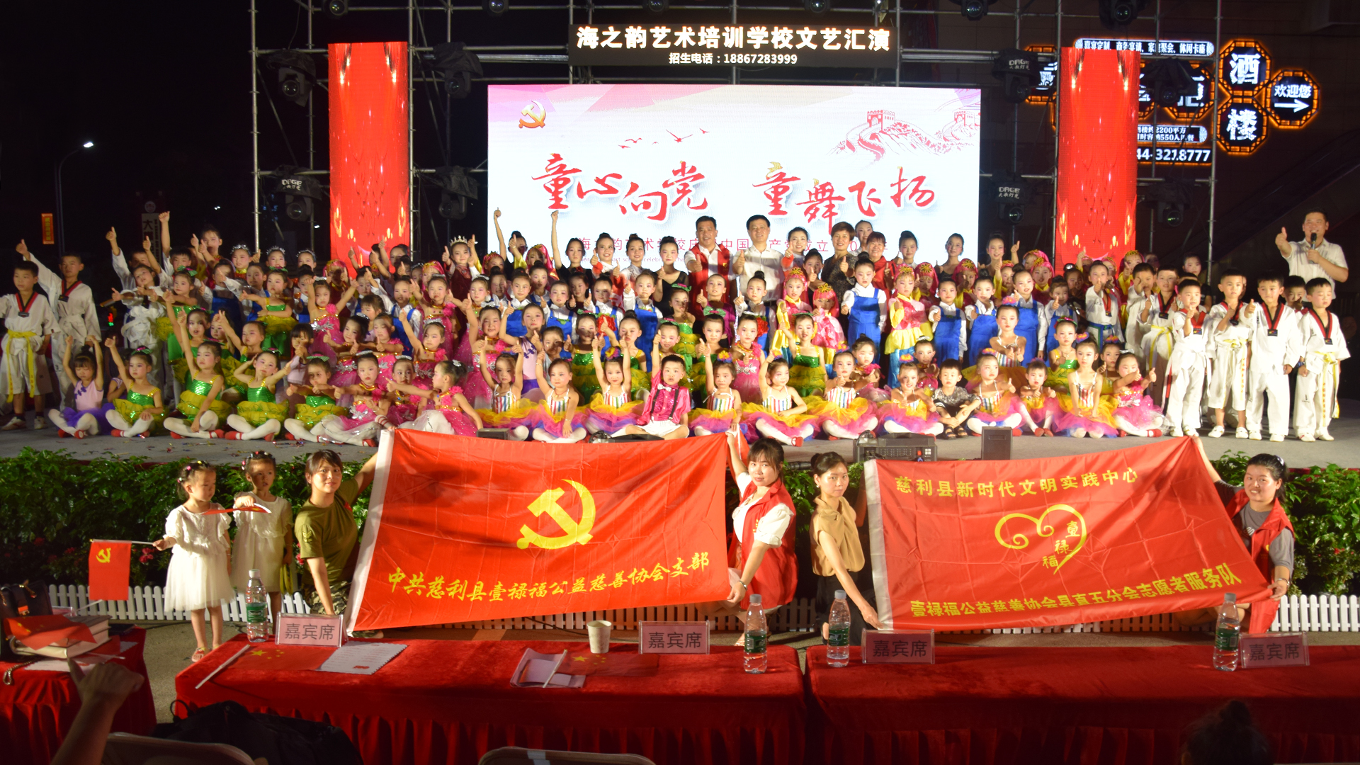 7月11日晚,新时代文明实践中心壹禄福公益慈善协会副会长、县直五分会会长、志愿服务队队长单位海之韵艺术培训学校庆祝中国共产党成立100周年文艺晚会在博联天街举办。参加活动的有:慈利县关心下一代工作委员会办公室主任李平方,全国劳模王开慈,中共慈利县壹禄福公益慈善协会支部书记、会长、县禁毒协会会长刘永岗,壹禄福公益慈善协会监事长、通津铺镇关爱儿童之家负责人、县鸿运创客科教中心董事长高小芳,壹禄福公益慈善协会秘书长、小易文化&易道教育培训学校校长王喻,零阳镇留守儿童之家负责人孙清华,壹禄福公益慈善协会副会长、均瑶味动力慈利总经销沈江涛,壹禄福公益慈善协会副会长兼通津铺镇分会会长卓军,壹禄福公益慈善协会副会长兼关爱军人分会会长、81号兵站张家界联合创始人夏宏辉、爱心壹禄福县直五分会志愿者和海之韵艺术培训学校的全体师生及家长。
