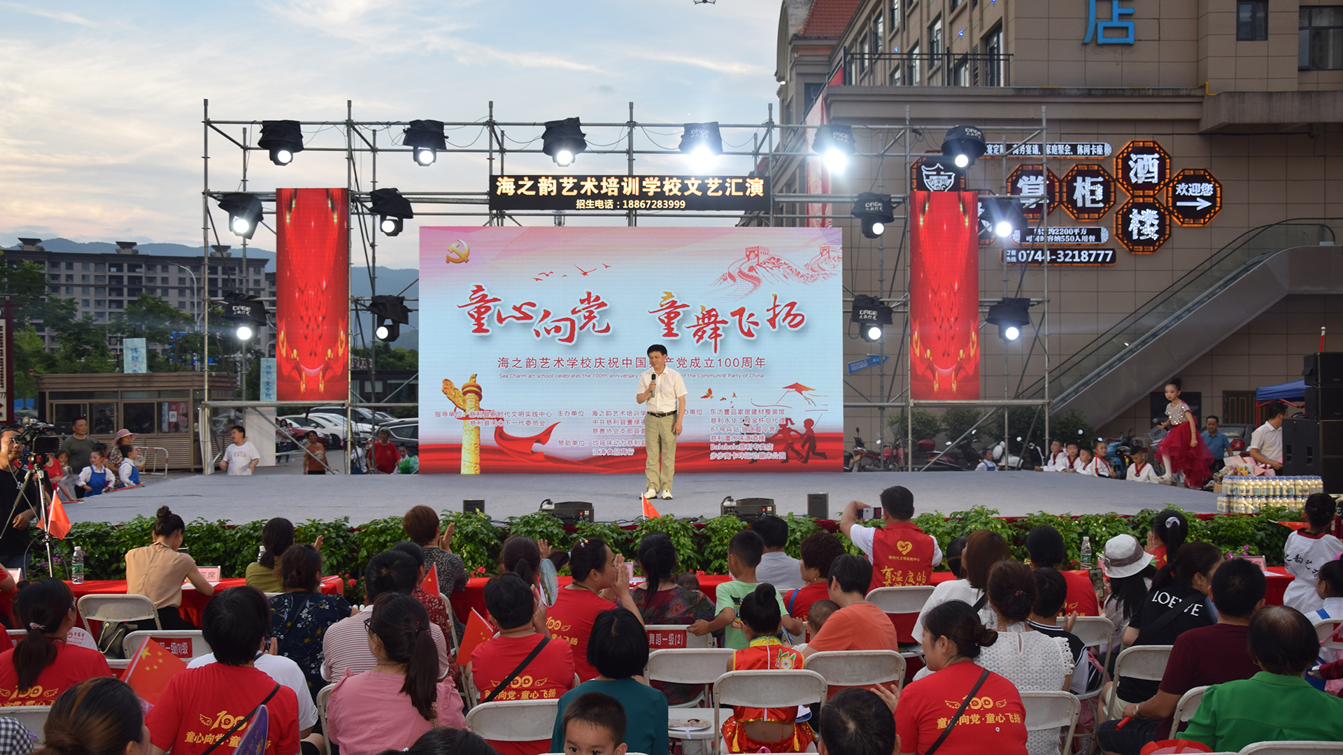 (慈利县关心下一代工作委员会办公室主任李平方为大家上党史教育课,并宣布海之韵艺术培训学校庆祝中国共产党成立100周年文艺晚会正式开幕)