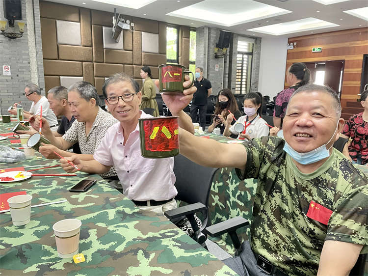 义诊结束后,社工邀请老兵们一同进行红军搪瓷杯绘画制作,举杯同乐,共度佳节。在社工的指导下,老兵们将复古与情怀融合,将自己对军旅岁月的追忆、对祖国繁荣昌盛的祝福一并填绘在搪瓷杯上。