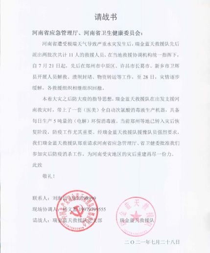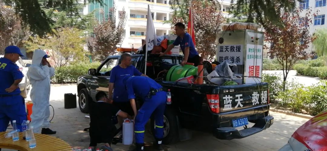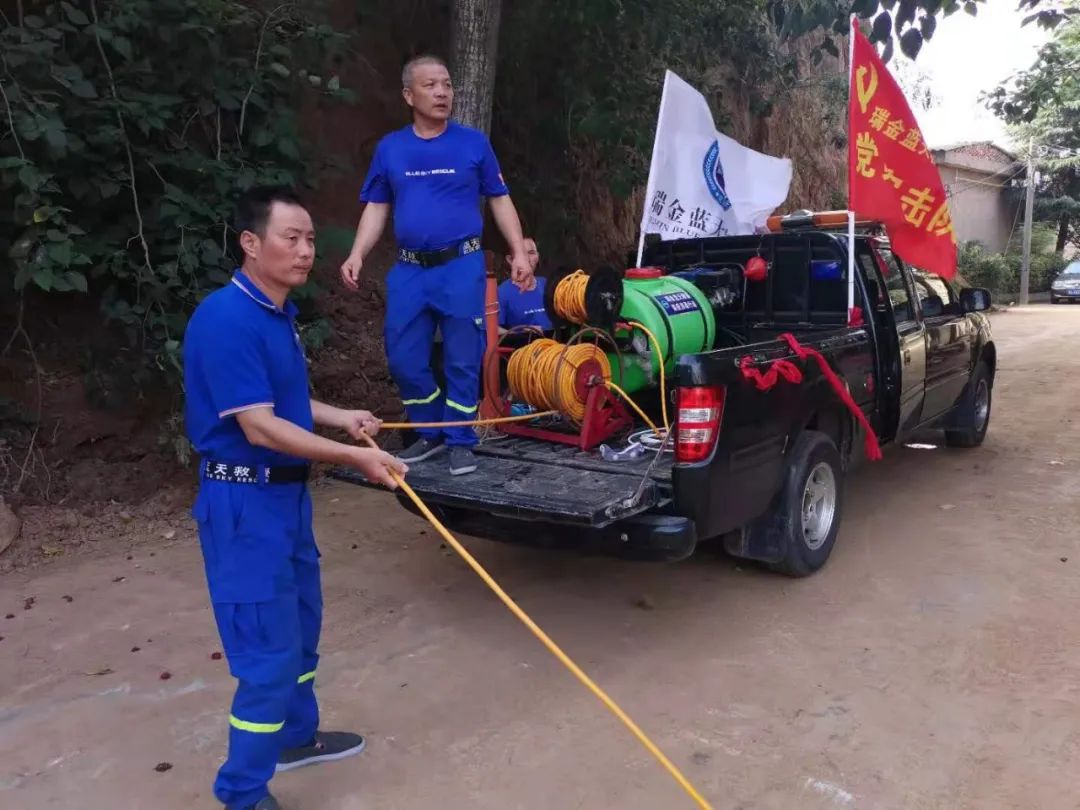 7月28日,随着河南灾情逐步缓和,各地救援组织相继回撤。杨文富、梁小明、邱剑文等瑞金蓝天救援队6人,主动向河南省应急管理厅和河南省卫健委请战,要求参加灾后防疫消杀工作,为河南灾后重建再尽一份力。杨文富讲道,“消杀我干过很多了,设备我们也有。”