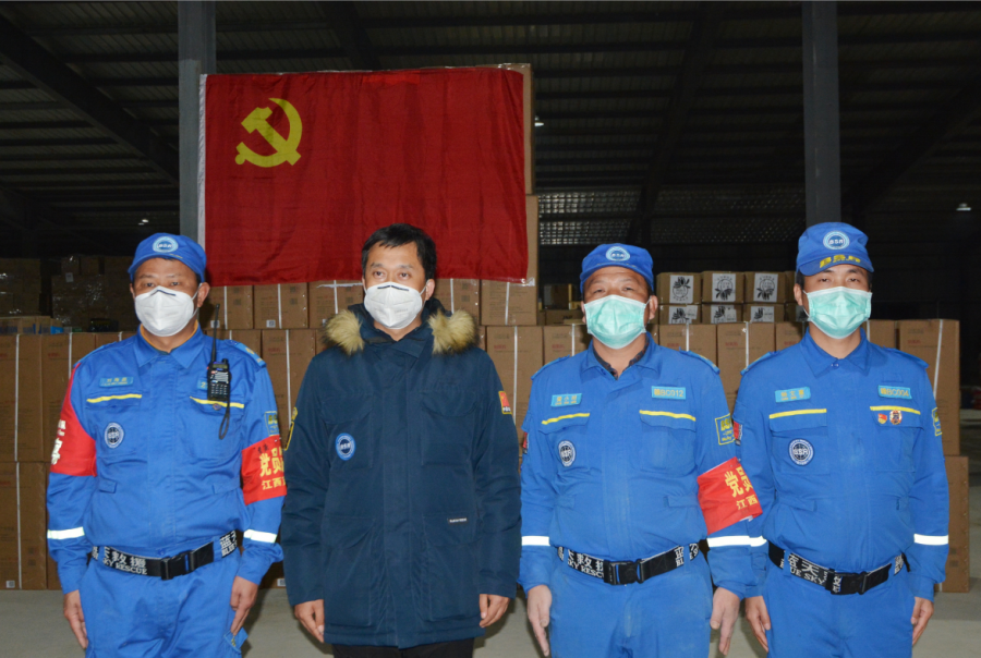 2020年春北京蓝天救援队队长张勇与瑞金蓝天救援队支援武汉队员刘海昌、梁小明、杨文富在武汉合影