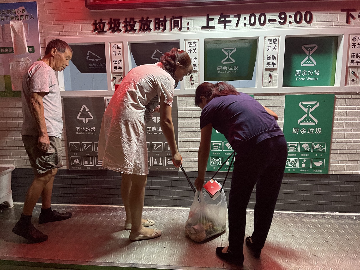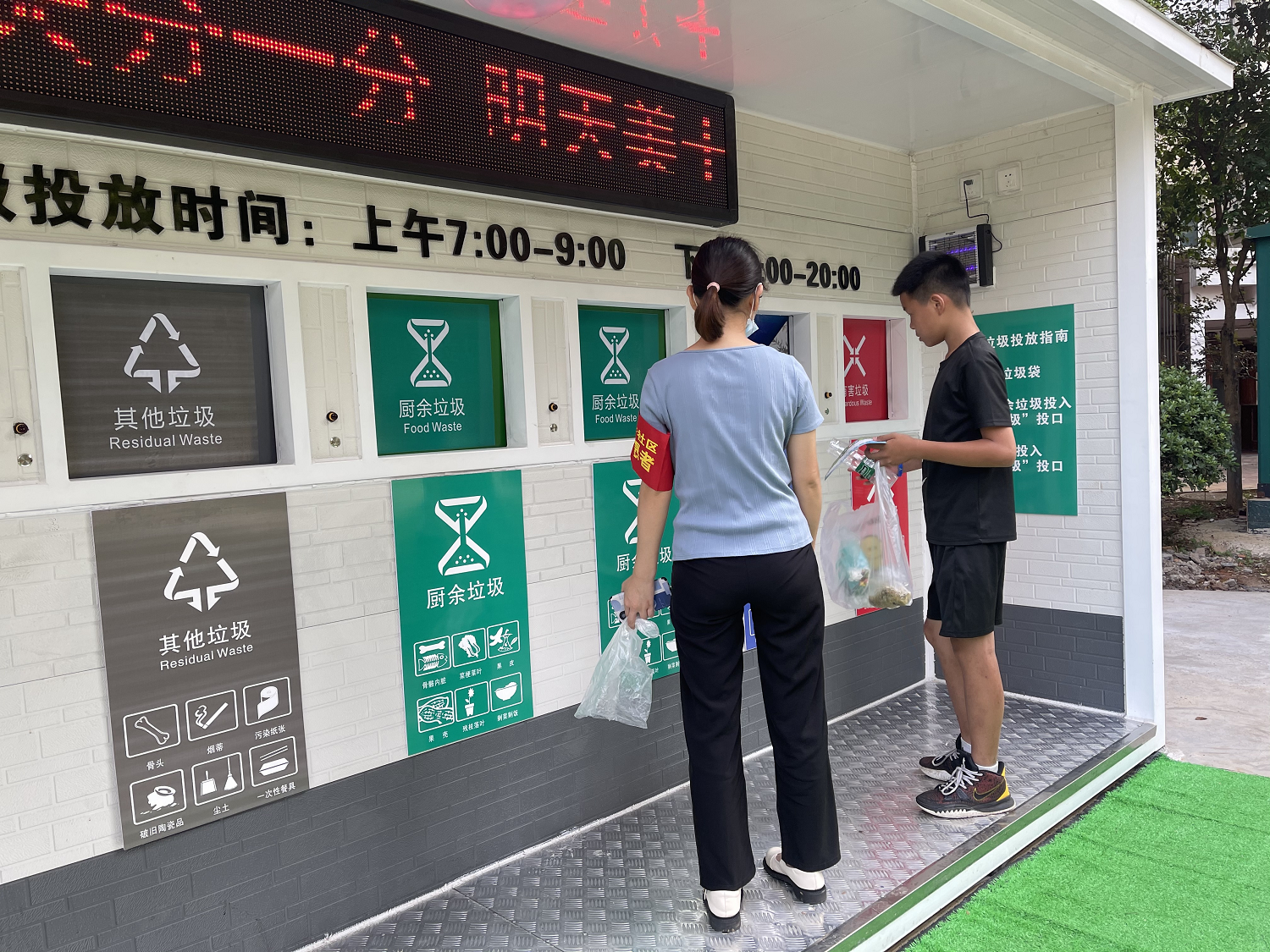 枫华府第小区实行垃圾分类撤桶并点定时定点投放后,对首开点位辐射区域楼栋范围内的两分类垃圾桶进行撤除,首开辐射范围内的居民生活垃圾统一投放至四分类定时定点投放驿站,驿站内拥有由社区工作人员、专业社会组织成员、物业专职督导员、小区志愿者组成的4人督导队伍,负责桶边专业指导+思想疏导+及时清运清理+示范引领等工作,同时,社区还动员小区热心退休居民,拉建起一支6人的“爱家”环保志愿小分队,分早晚两时段在小区撤桶范围内以口头劝导和小喇叭宣传等形式进行宣传,引导撤桶范围内居民前往驿站分类投放垃圾,以实际行动助力社区垃圾分类工作再推进。