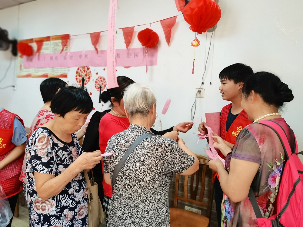 本次游园会设计了社说中秋、中秋灯谜会、套月饼以及中秋组词乐等四个适合老年人年龄层次和身体特点的游戏,每通过一个游戏,可获得石门楼社区及长沙市壹社区社会组织公益服务中心特地准备的月饼、花茶、扇子等实用礼品。面对纸灯笼上一排排有待发掘的谜面、桌上有趣且考验眼力、手力、脑力的套月饼和中秋组词乐游戏,社区空巢老人纷纷摩拳擦掌、大展身手,有序的穿梭于各个游戏摊位中,不一会儿,大家手中就提了满满的“战胜礼品”。本次活动将中秋节的习俗活动、传说故事等文化内容寄于游戏之中,使参与游园会的空巢老人们既能体会到节日的温暖快乐,也能从游戏中学习知识、锻炼身体。