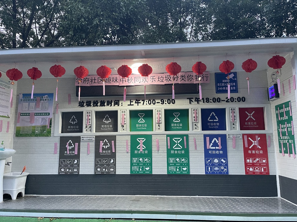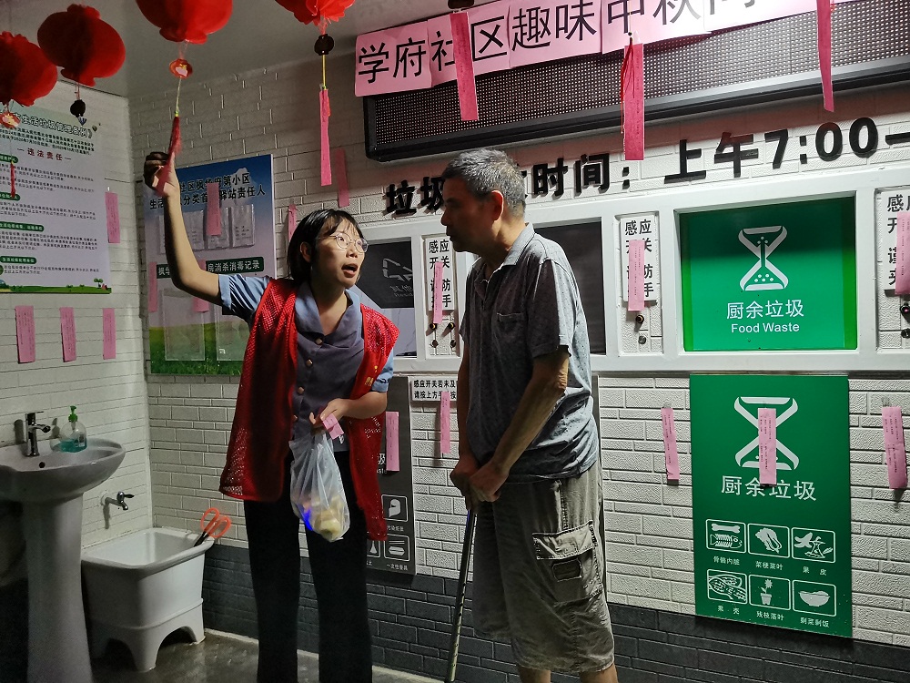 花好月圆夜,分类进行时。18日晚上,学府社区枫华府第小区首个垃圾分类撤桶并点定时定点投放驿站里灯火通明,欢声笑语不断。“中秋月饼的塑料内包装应该是其他垃圾吧”,“是的,之前社区志愿者说过,食品塑料包装袋都是其他垃圾”,面对驿站里一排排垃圾分类谜题,前来驿站分类投放垃圾的居民们都跃跃欲试,有的独自细细琢磨,有的相互讨论,集思广益,气氛十分热烈。