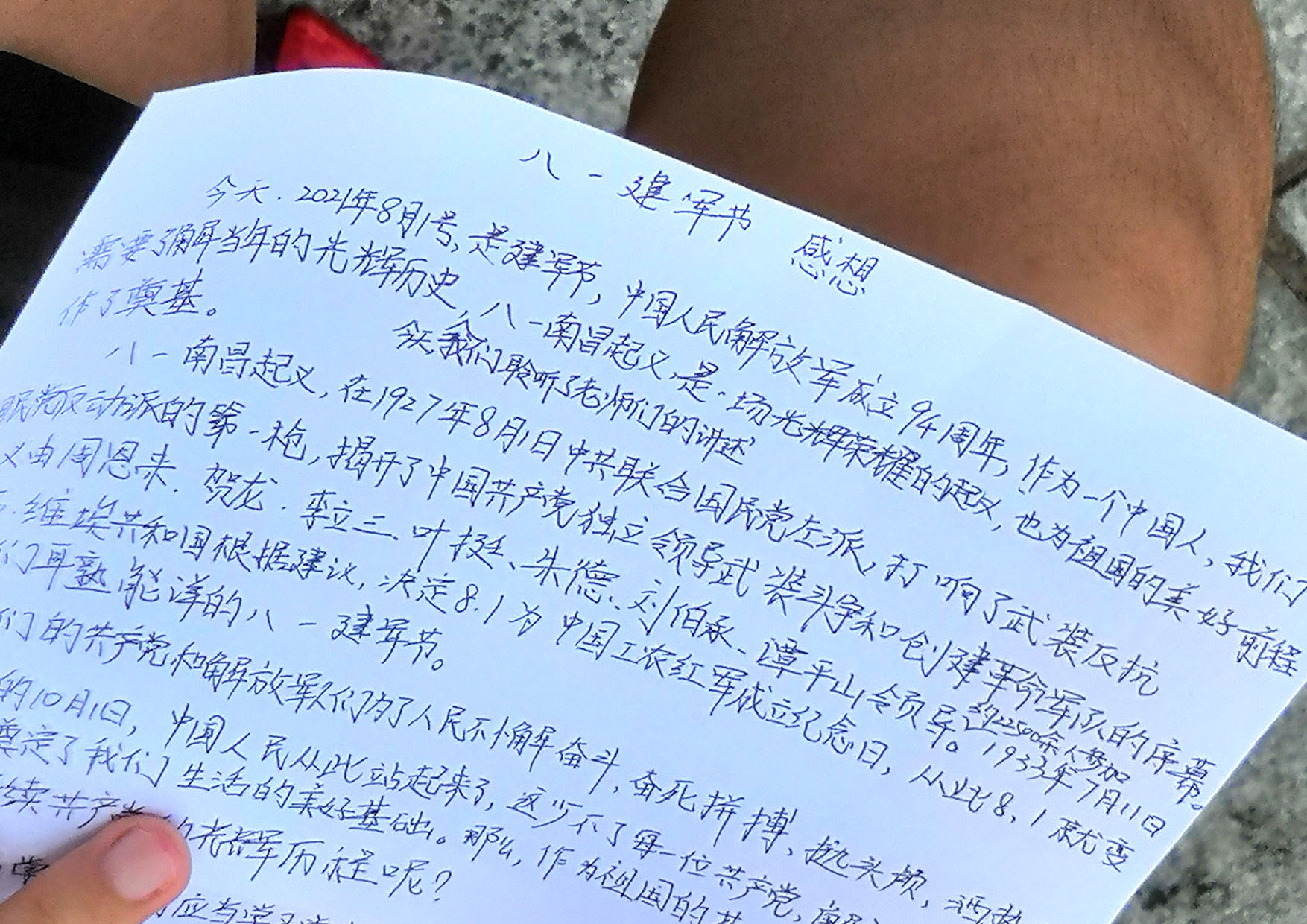 为8月1日上午,“红色文化小天使暨庆祝八一建军节——南昌起义分享会”在仁威庙志愿驿站举行,近百位青少年儿童和家长们一起聆听由已故伟人周恩来、贺龙等领导下的中国共产党人为反抗国民党反动派屠杀政策打响的武装战斗故事。在分享会后,红色文化小天使积极发挥想象力,采用绘画、手抄报等方式向中国军人致敬,并立志成为新时代合格的接班人。