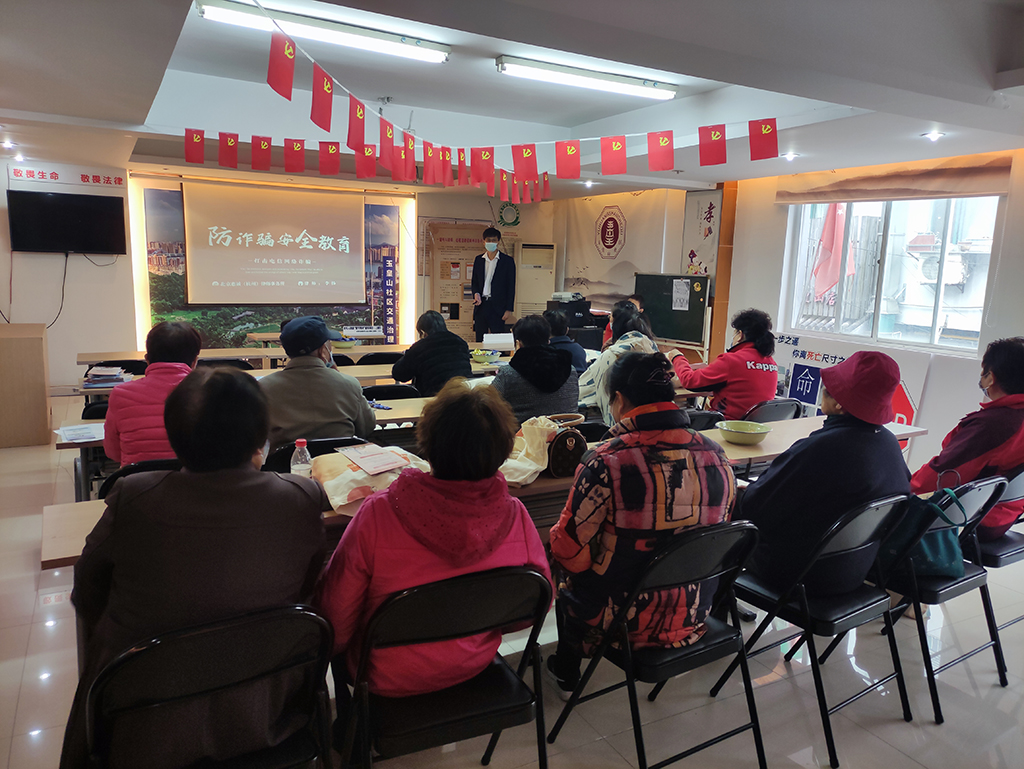防诈骗宣传讲座活动中,李律师通过PPT讲解与真实案例分享相结合的方法,向居民们介绍了投资理财诈骗、网络交友诈骗、冒充公检法诈骗等几大常见诈骗类型的套路和应对措施,并通过一个趣味小视频总结了老年人防诈骗的口诀与技巧,最后向居民们推荐了“国家反诈中心”APP。