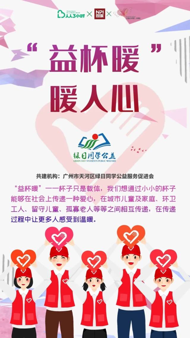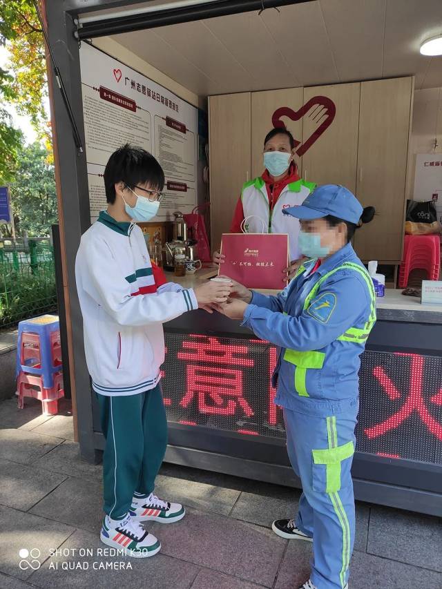 12月4日至5日期间,为庆祝第36个国际志愿者日,进一步倡导“人人公益,处处可谓”的理念,广州市天河区绿日同学公益服务促进会联合广州市天河区环保产业行业协会、广州市荔湾区仁威庙志愿驿站、广州荔湾巡河护河志愿服务队、广州开发区善德助学促进会、绿日集团积极开展“益杯暖•暖人心”行动。为最美城市美容师、快递小哥、安保特勤人员、建筑工人等城市最美建设者以及长者奉上姜汤热茶,并向他们送上祝福和慰问品。