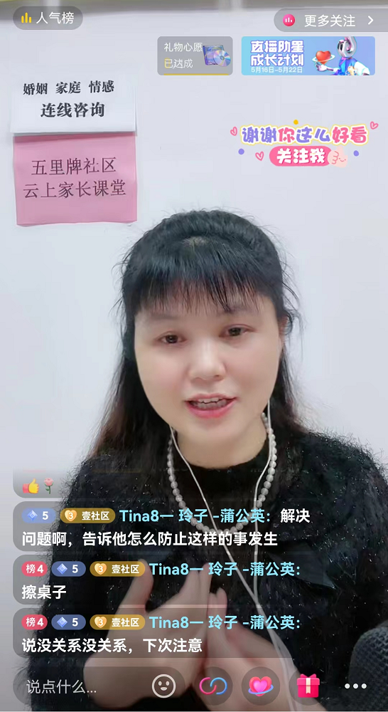 父母是孩子成长的第一责任人,如何做一名智慧父母,是每一名家长需要学习的内容。5月20日晚,五里牌街道五里牌社区携手长沙市壹社区社会组织公益服务中心举办了一场“家社携手 共话成长”云上家长课堂活动,以线上直播的形式与社区家长见面,共话孩子成长。