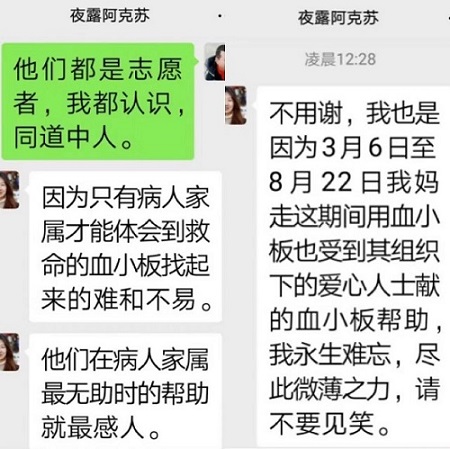 阿布都如苏说:“大哥,你好,给我的筹款链条捐款1000元那位女士,我认识,我们曾经帮助过的病人家属。她母亲因病住院,急需血小板。从今年3月份到8月份,团队志愿者60人次献血,累计献血约5-6公斤左右。当时病人和家属非常激动,说一定要感谢一下献血的志愿者。我告诉病人家属献血志愿者有行规,规矩不能破!”