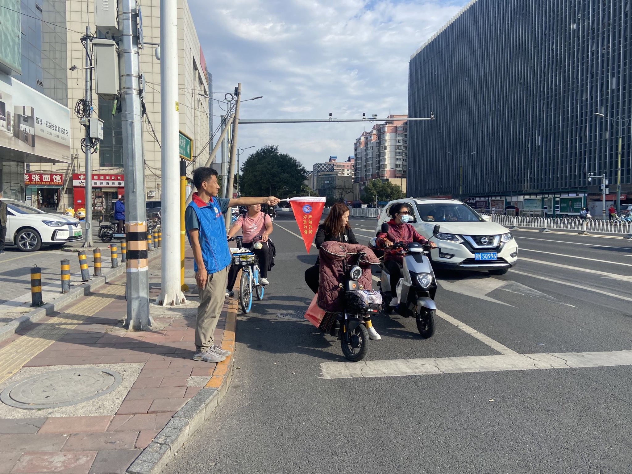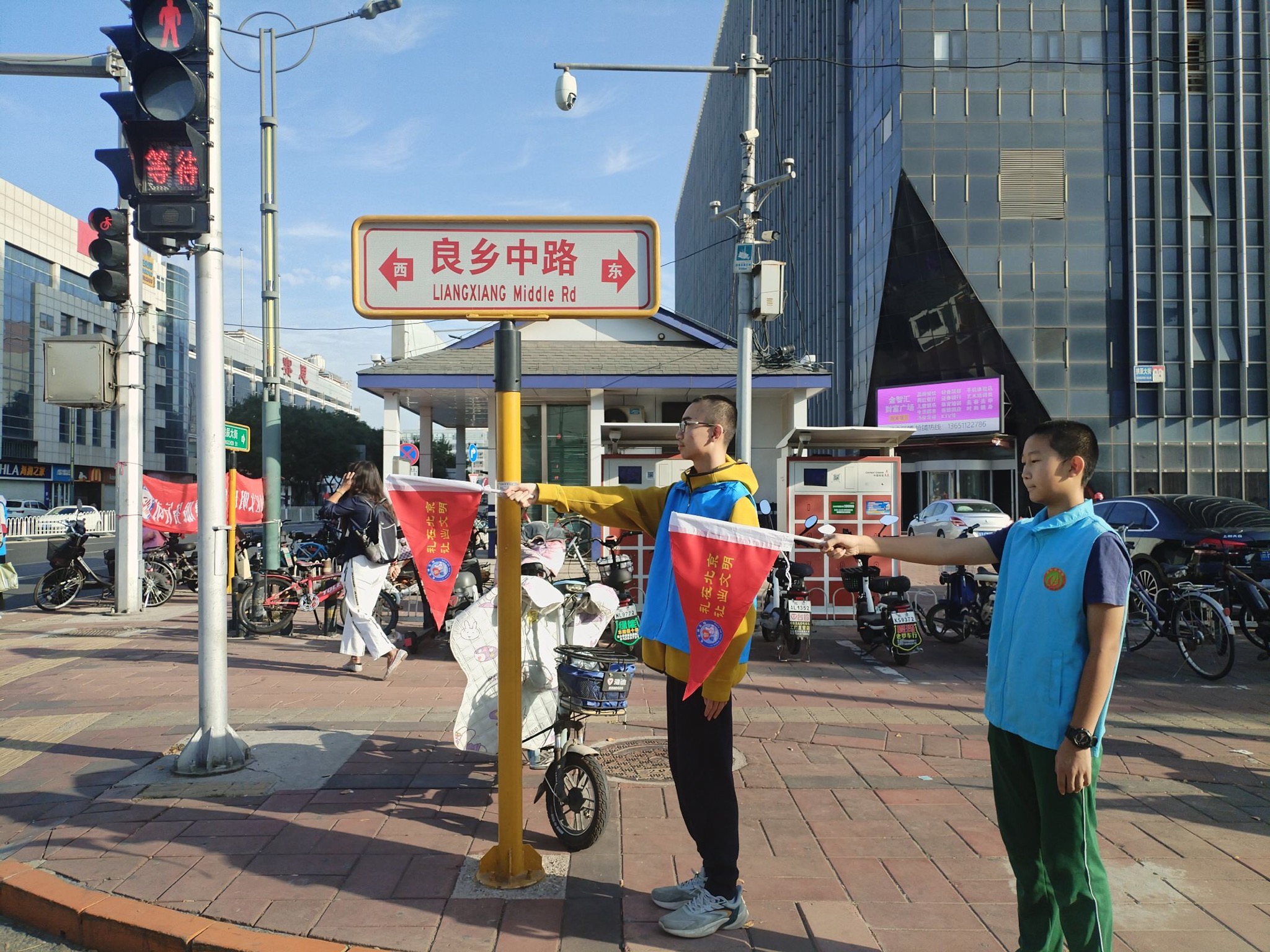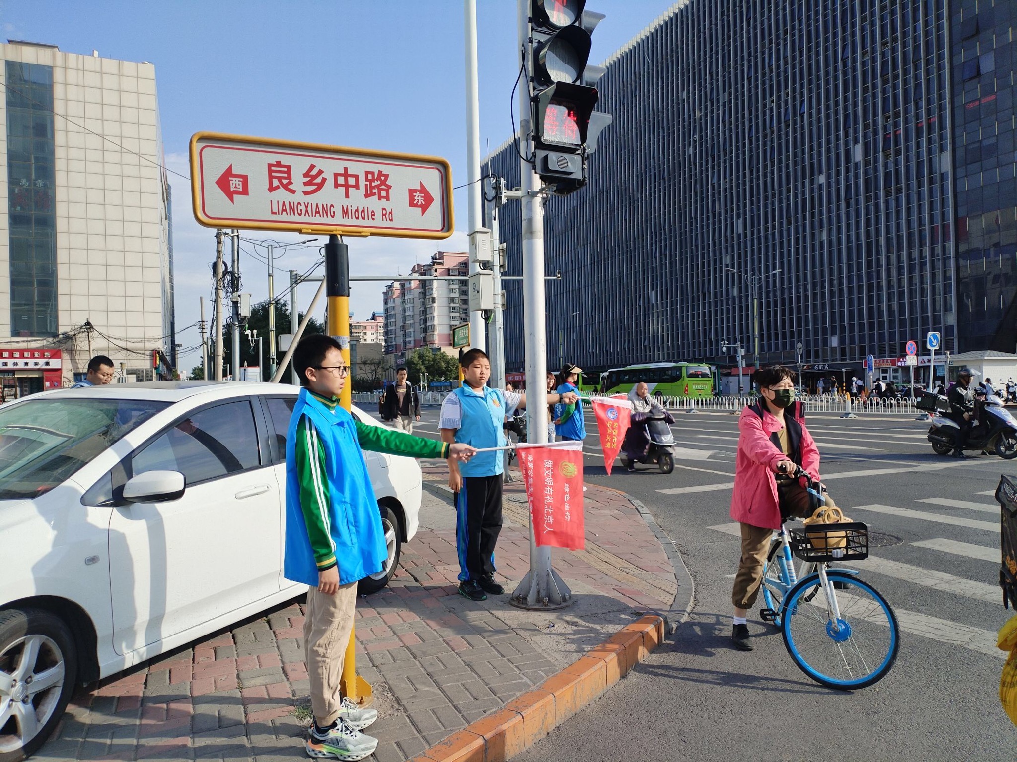 2023年9月29日上午,绿萝志愿服务队“礼让斑马线”志愿活动在良乡大角红绿灯展开。
