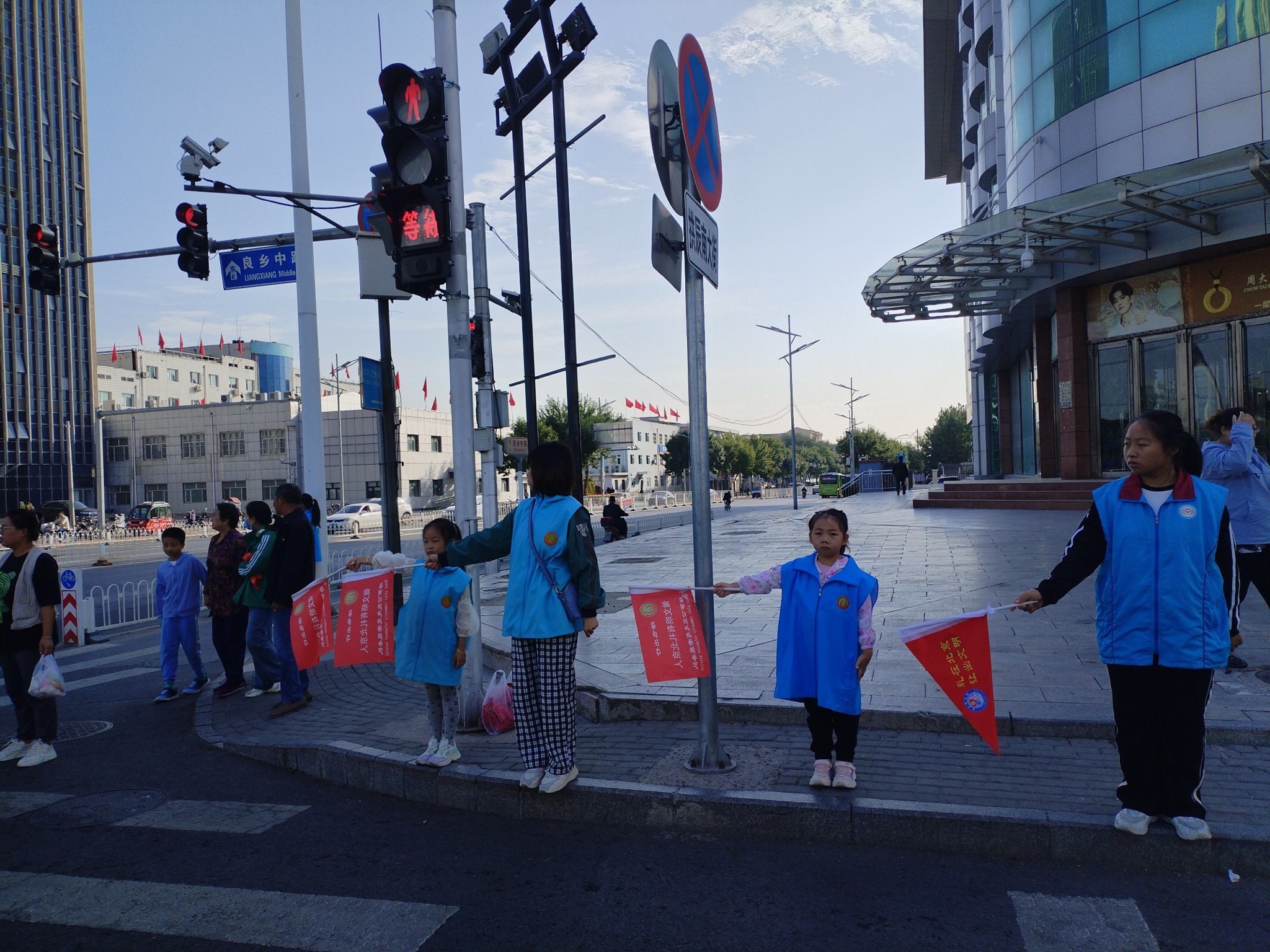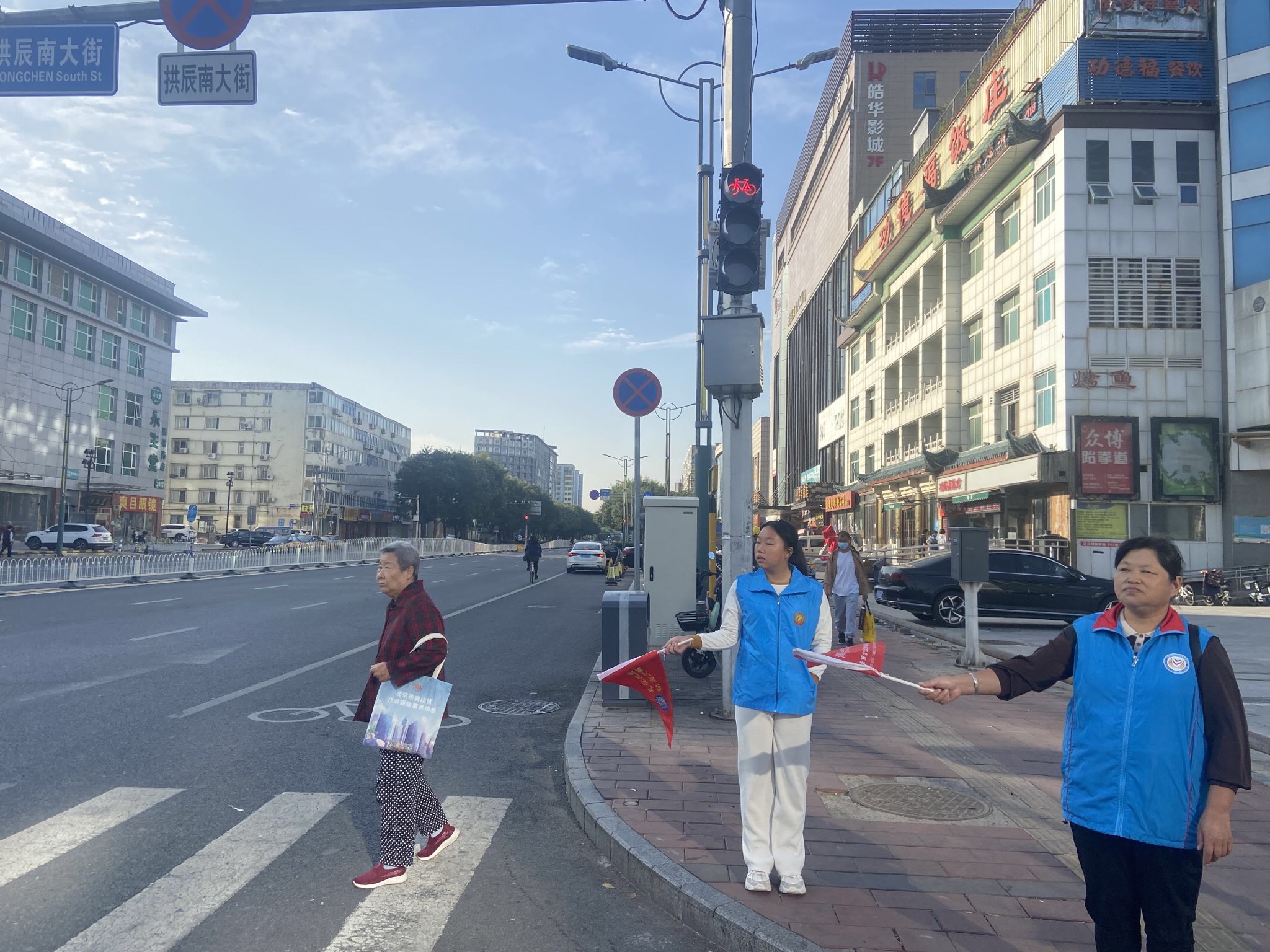 节假日的十字路口车水马龙,志愿者们身着蓝色马甲,站姿挺拔,动作标准,持宣传旗对行人闯红灯的行为进行指导,同时向路人宣传安全法规,提供问路等服务,劝阻不遵守交通秩序的行人。清澈的志愿蓝构成了大角十字路口上一道靓丽的风景线。