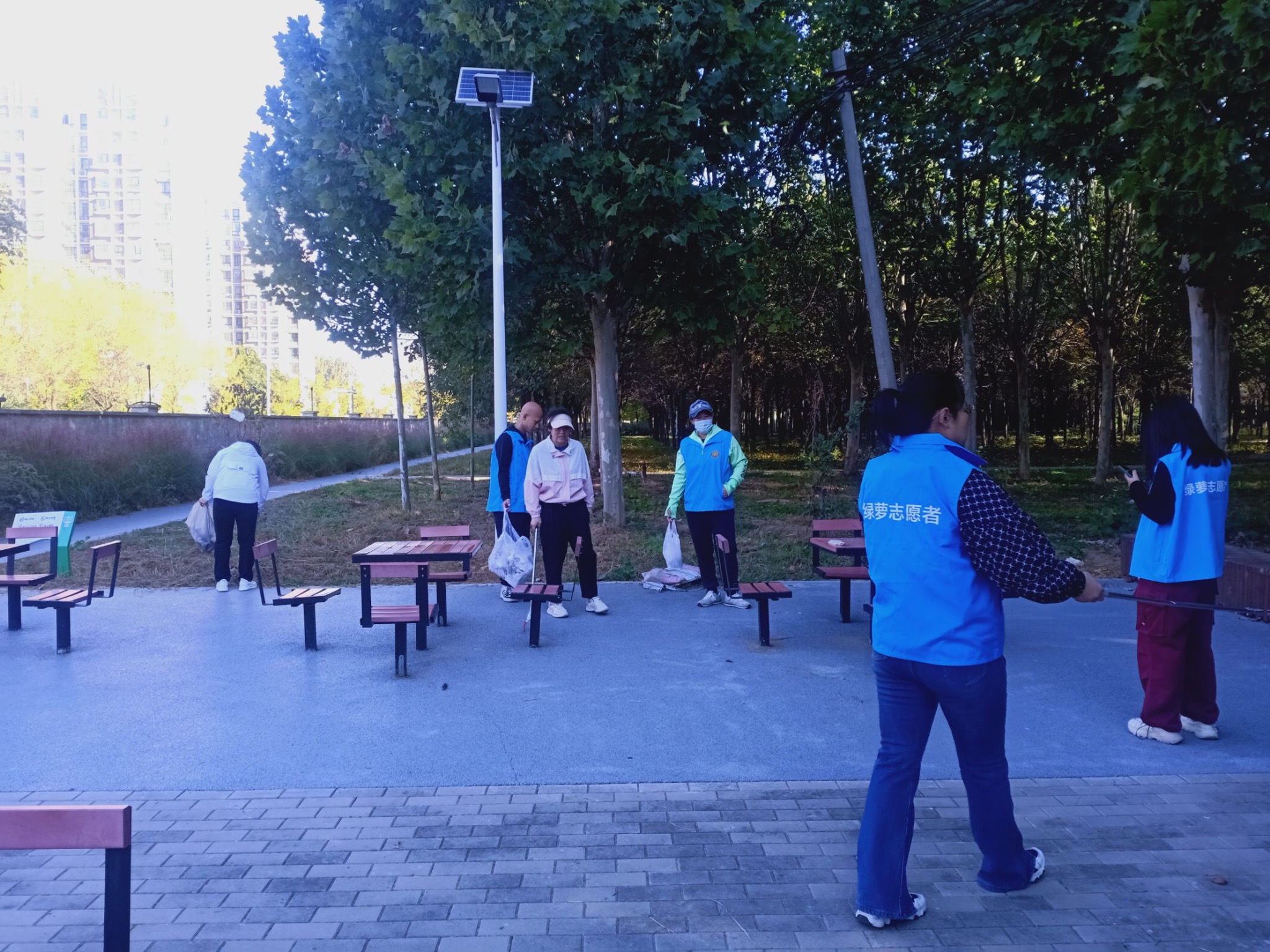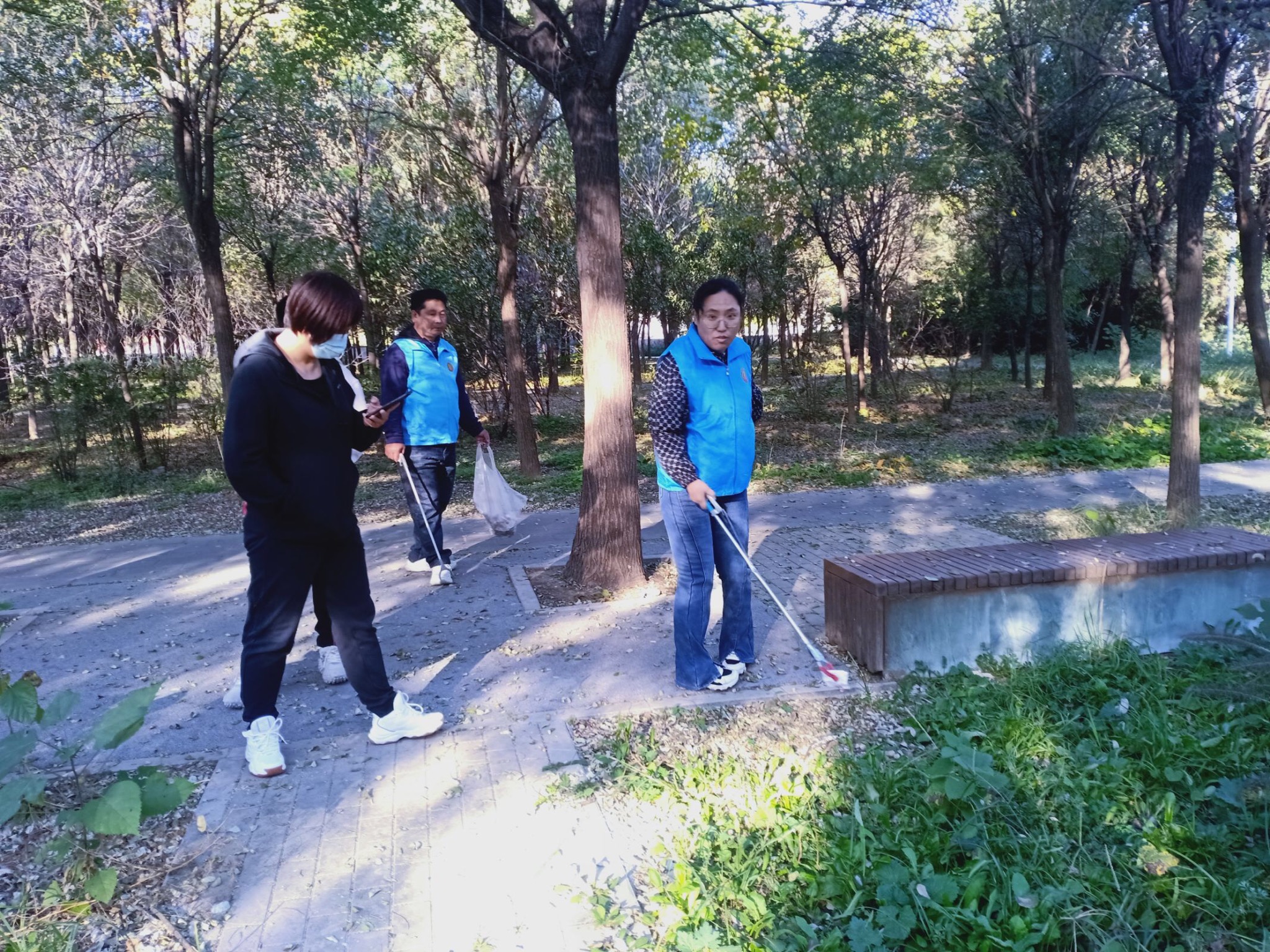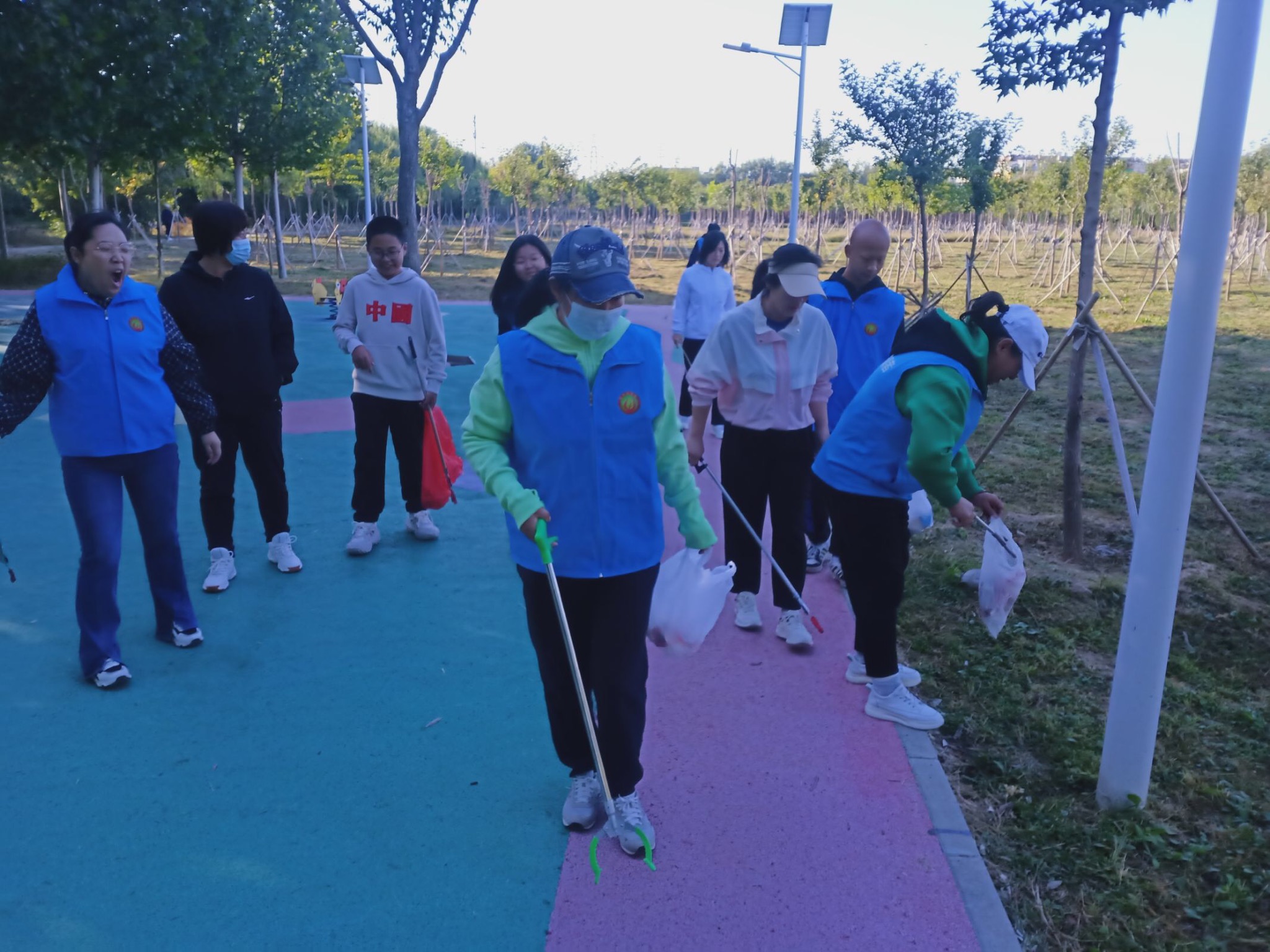 晚秋的早上的凉意也阻挡不了志愿者服务社会的脚步。大家用自备的的夹子,将在草丛中发现的纸屑、零食包装、塑料瓶等废弃物捡拾到垃圾袋中并做好分类。