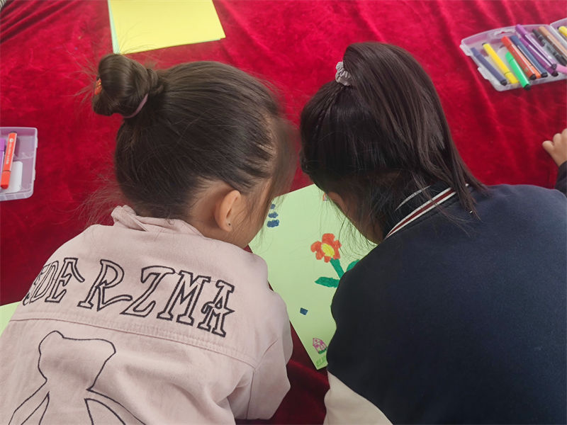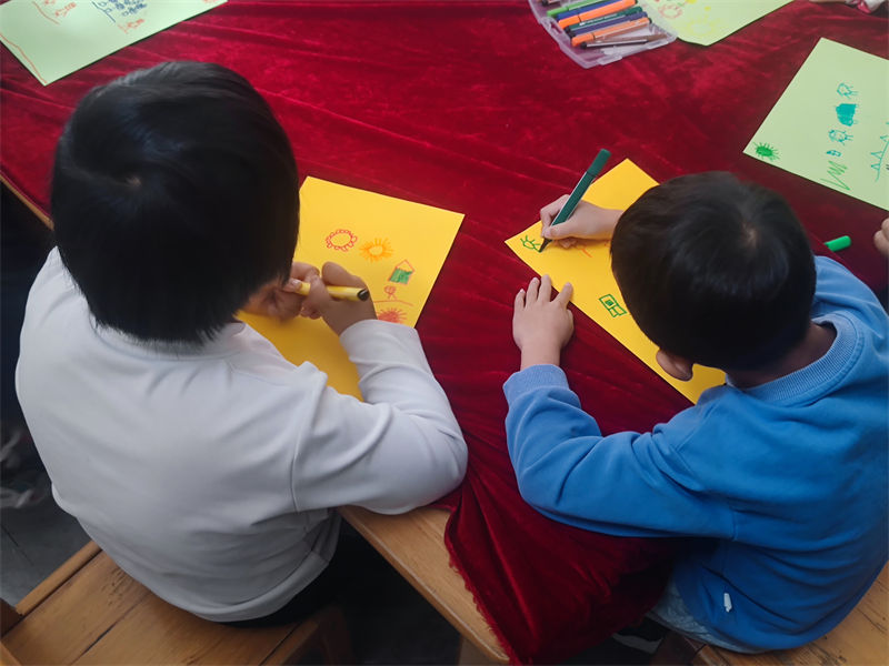 活动中,以心愿梦想和爱我家园为主题,社工和志愿者引导孩子们发挥想象力和创造力,投入到绘画的世界里;在社工和志愿者引导协助下,孩子们拿着画笔兴致勃勃地绘画,小心翼翼地描绘出一幅幅生动的画面,画面中有房子、有家人、有红花绿树、有星月太阳……,孩子们用画笔诉说着自己的爱意和想象。活动现场回荡着孩子们的欢声笑语,弥漫着欢乐的气息。