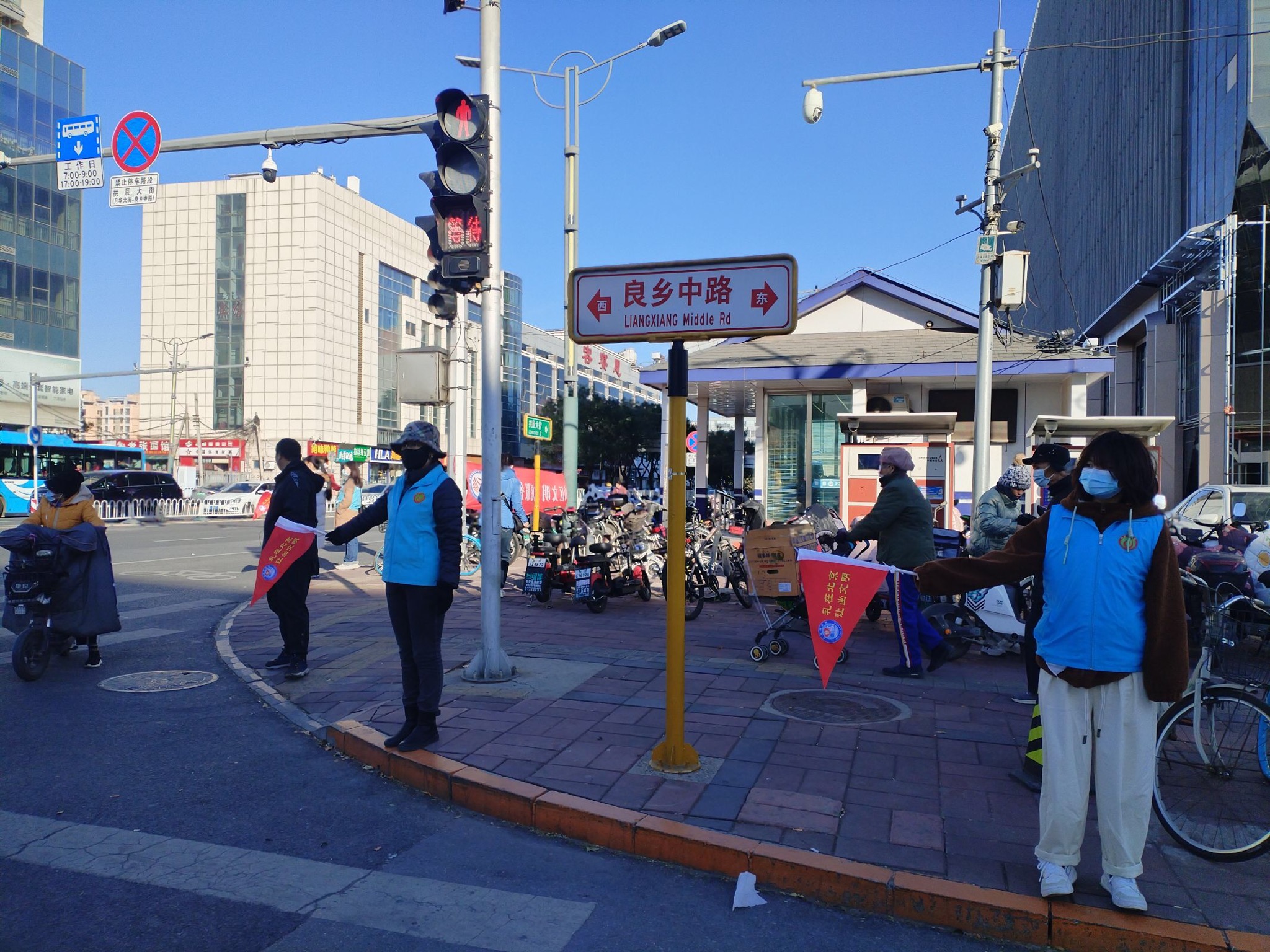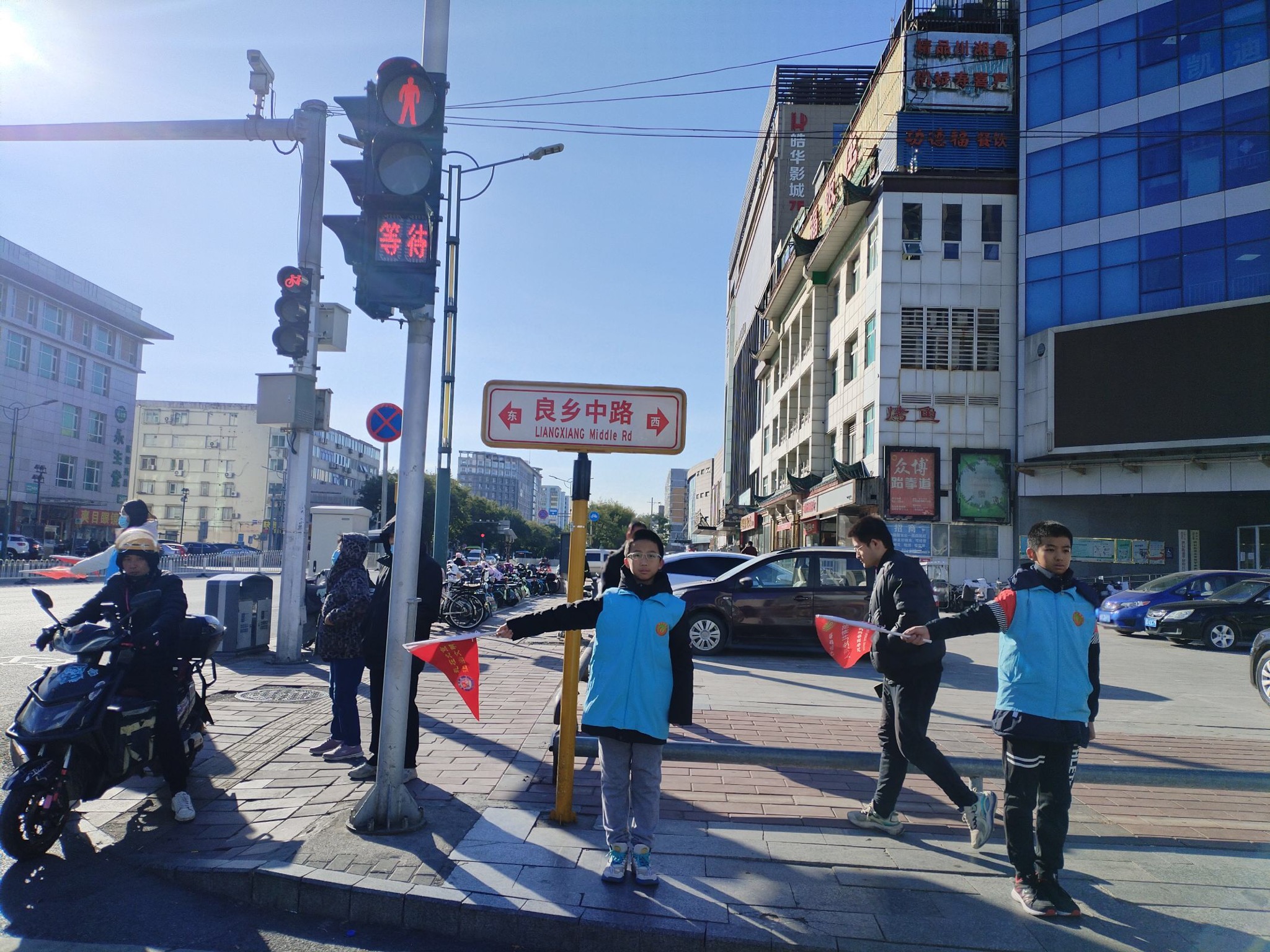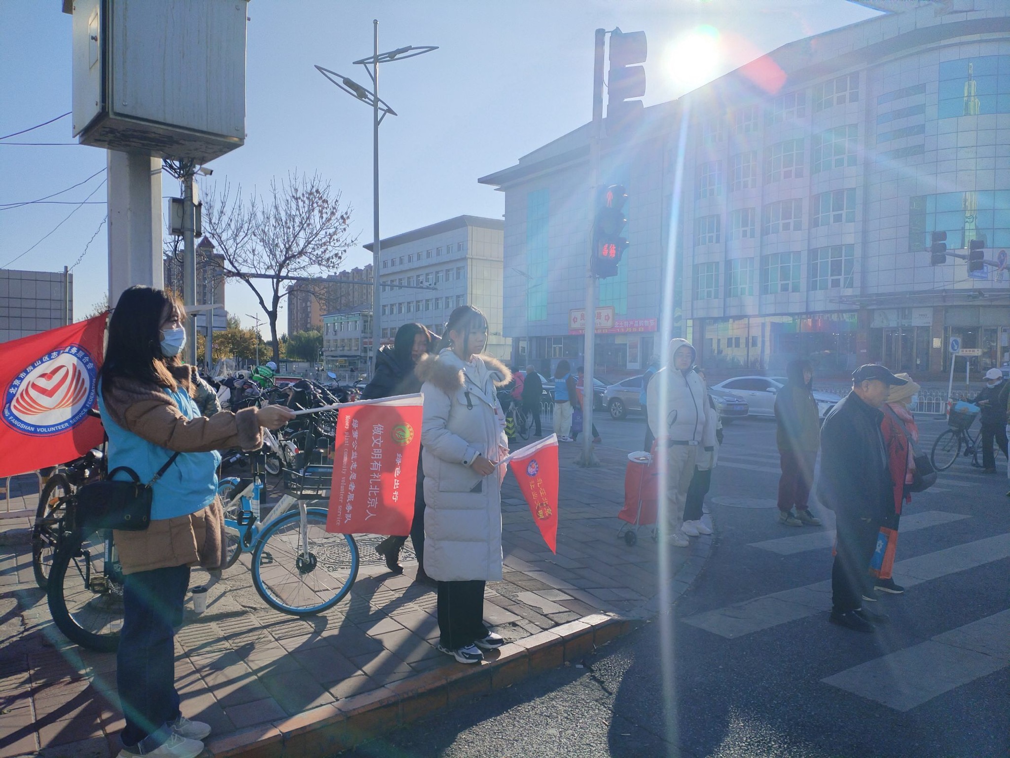 2023年11月11日上午,绿萝志愿服务队“礼让斑马线”志愿活动在良乡大角红绿灯展开。正值周末早高峰,大角路口秩序井然。当绿灯亮起时,行色匆匆的路人、晨起锻炼的老人从斑马线上穿过马路,右转的机动车则在斑马线前自觉停车等待。