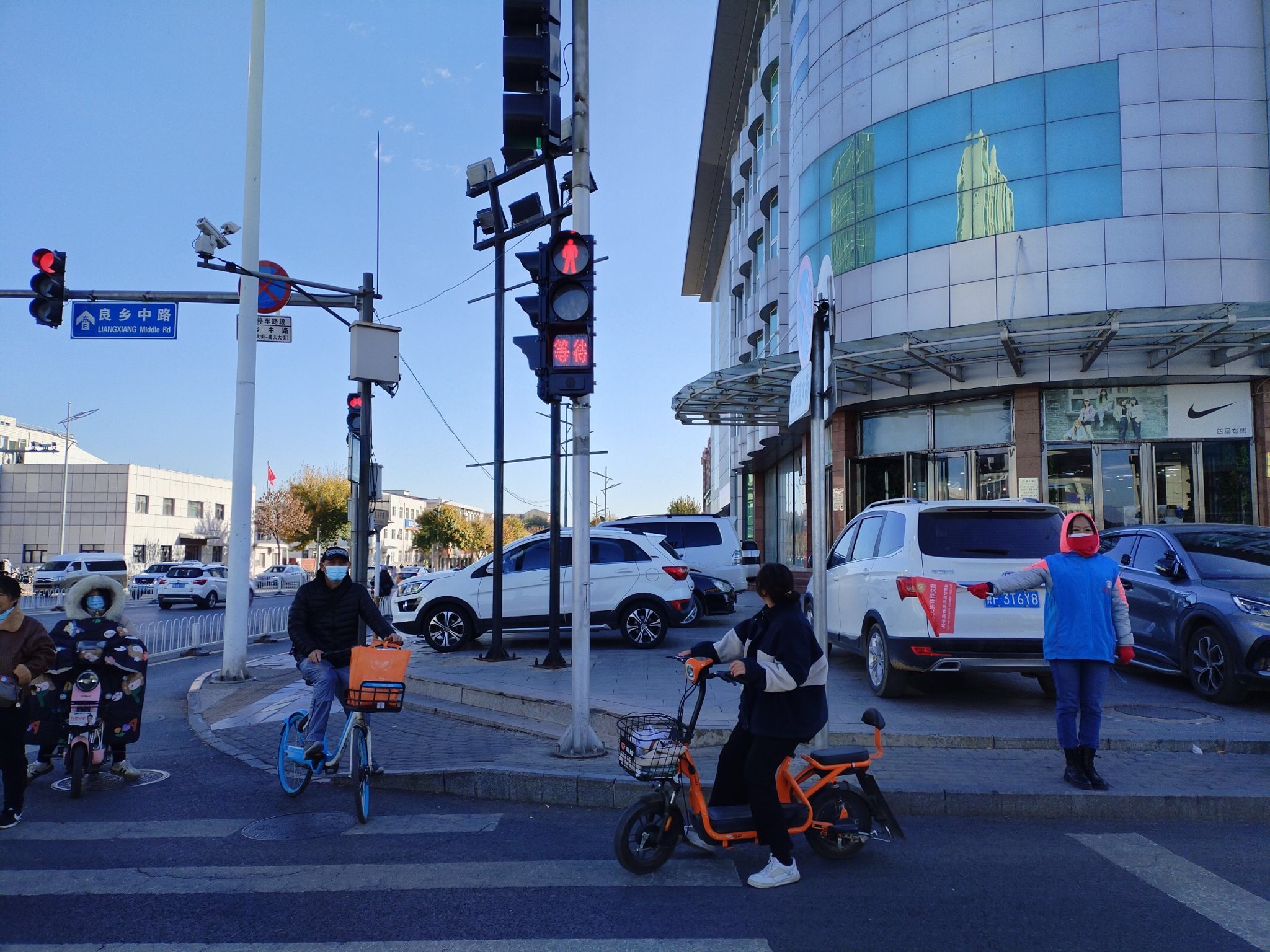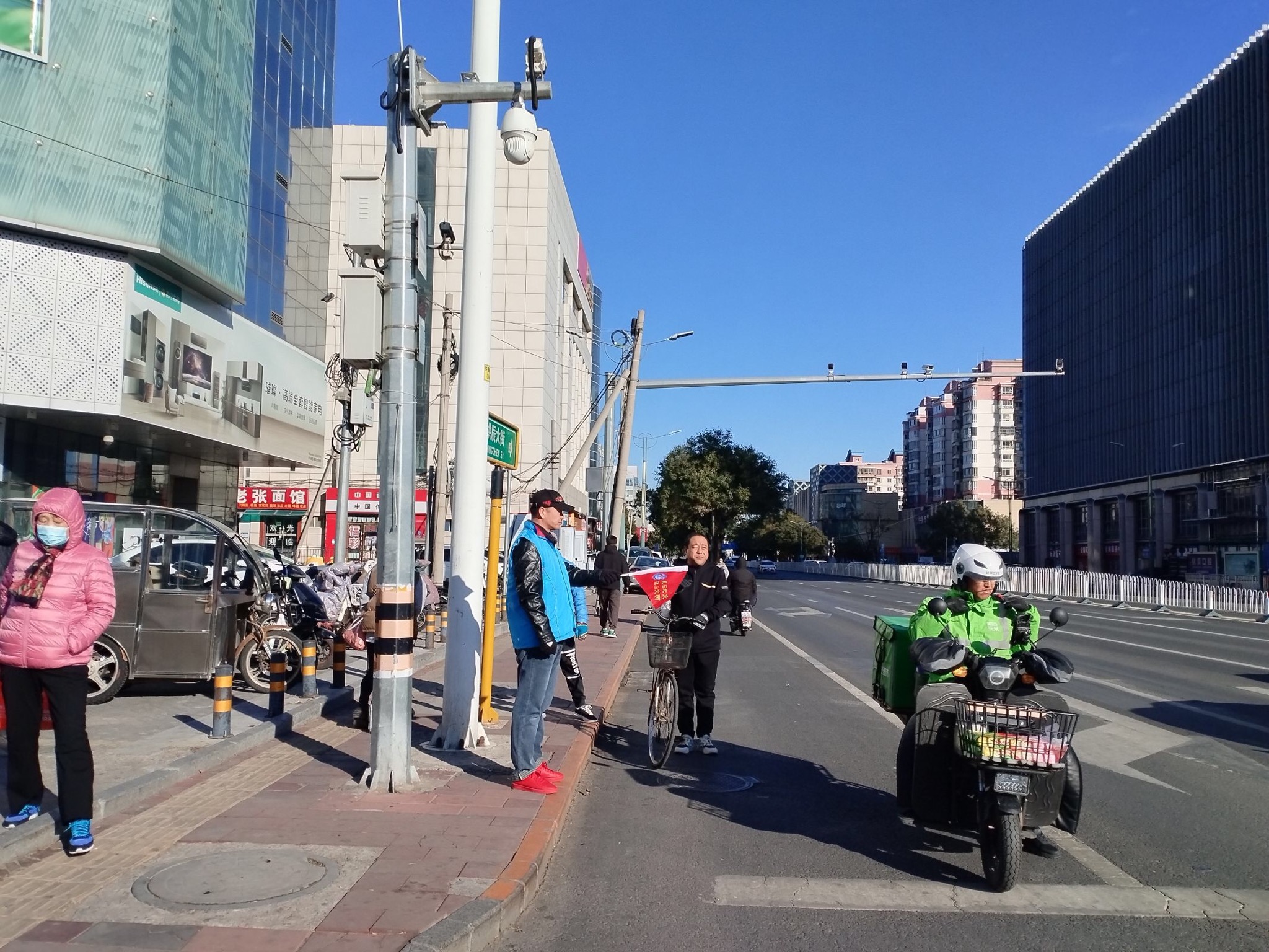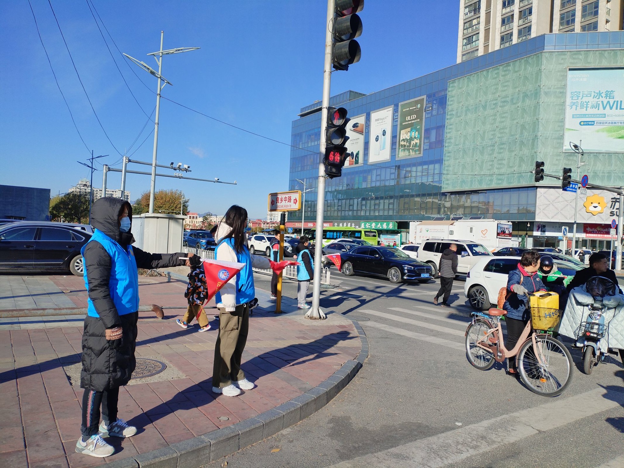 2023年11月11日上午,绿萝志愿服务队“礼让斑马线”志愿活动在良乡大角红绿灯展开。正值周末早高峰,大角路口秩序井然。当绿灯亮起时,行色匆匆的路人、晨起锻炼的老人从斑马线上穿过马路,右转的机动车则在斑马线前自觉停车等待。