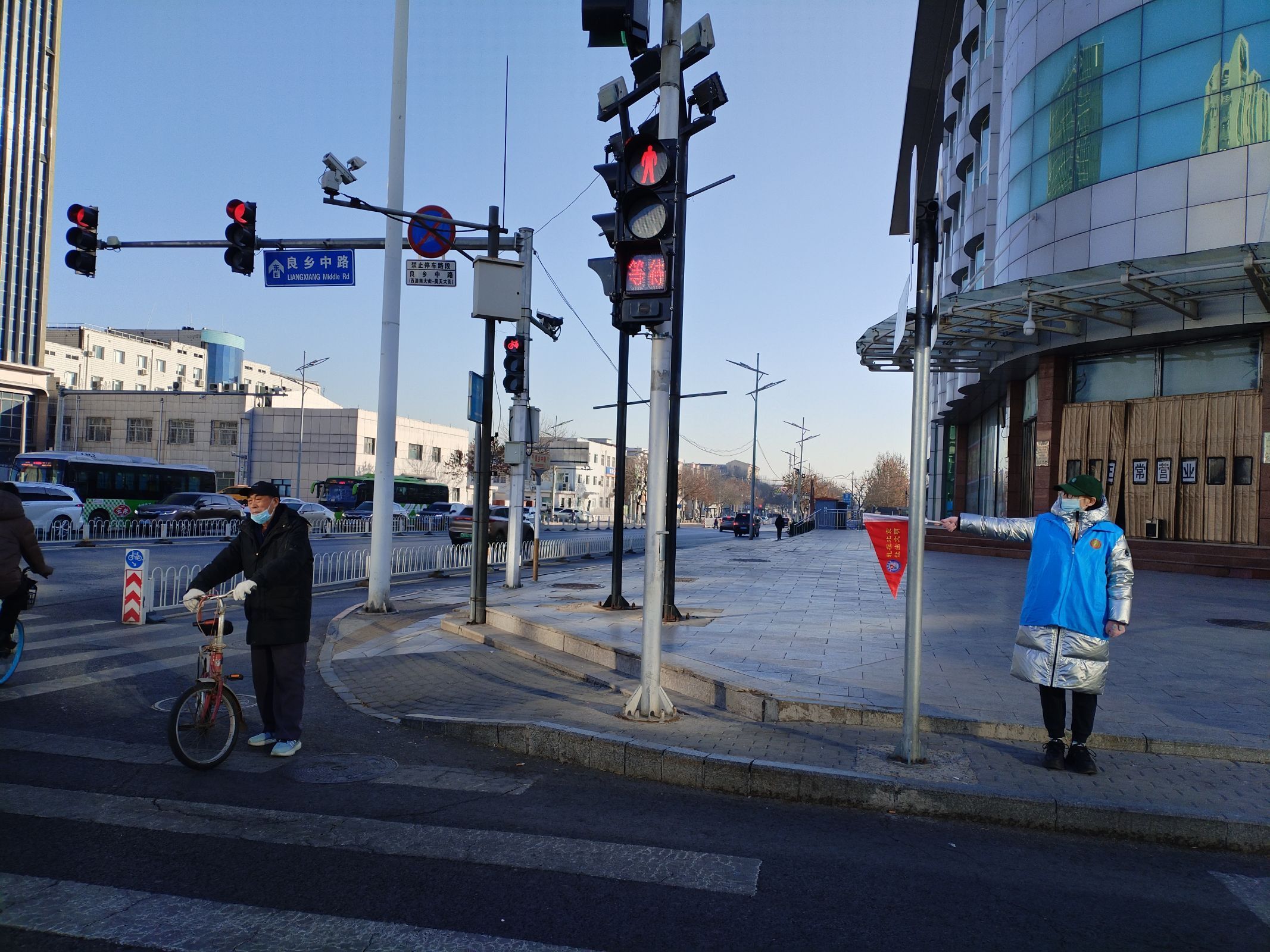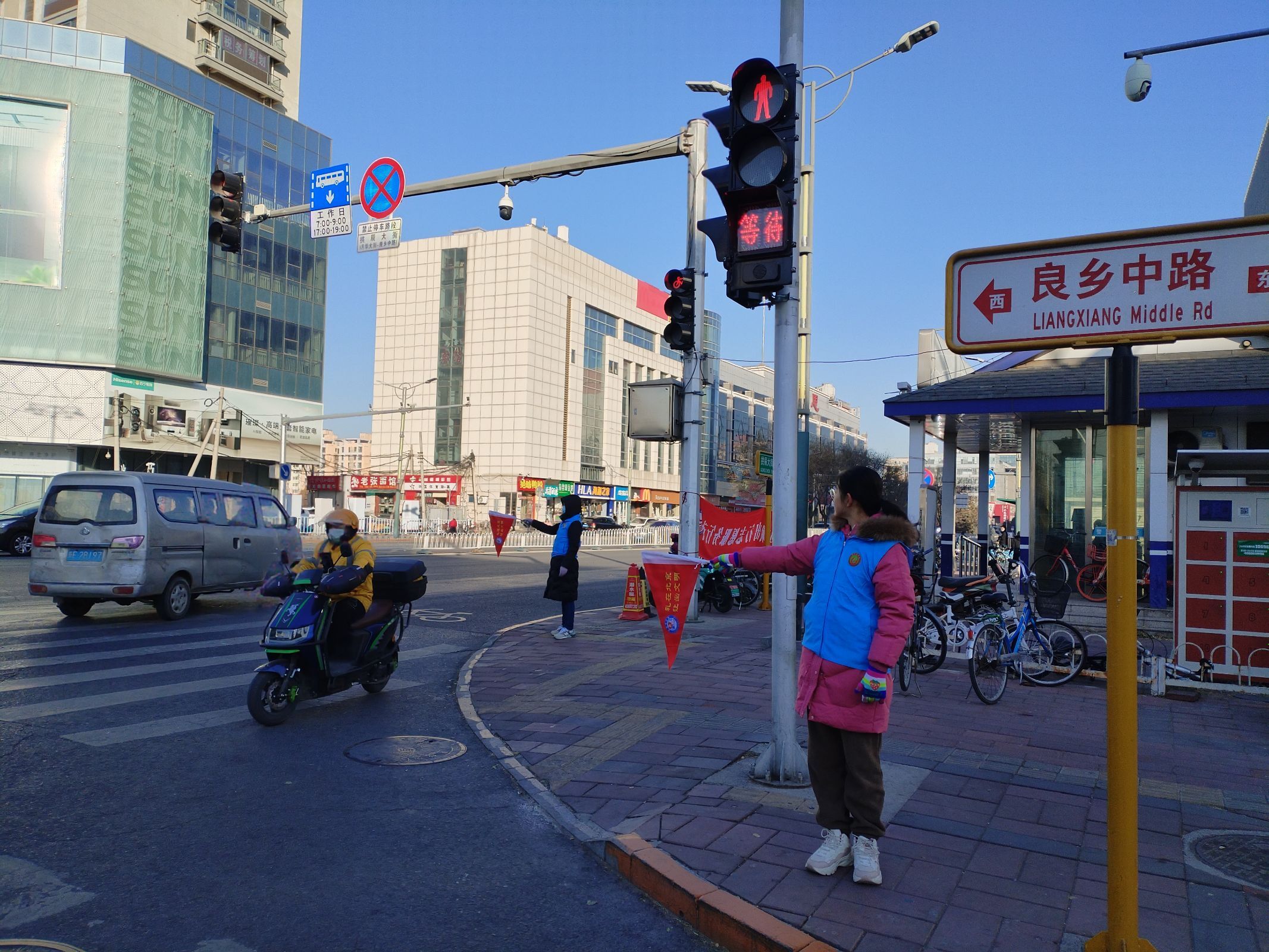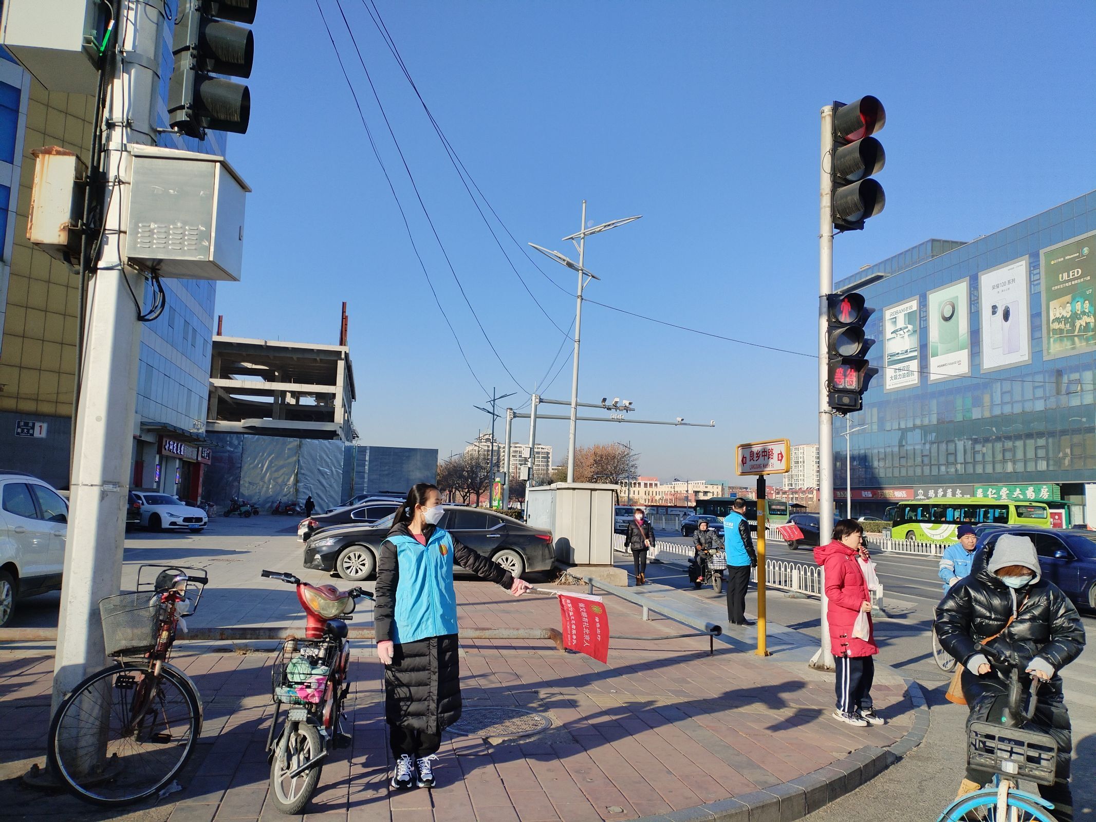 在人流和车流高峰时,志愿者身穿蓝色马甲,手握文明劝导旗,积极地维护交通秩序,提醒市民不闯红灯、不逆向行驶、不斜穿马路、不违规驶入机动车道,并对过往行人进行交通安全知识的宣传,提高了市民文明交通意识,营造了安全、畅通的交通道路环境。