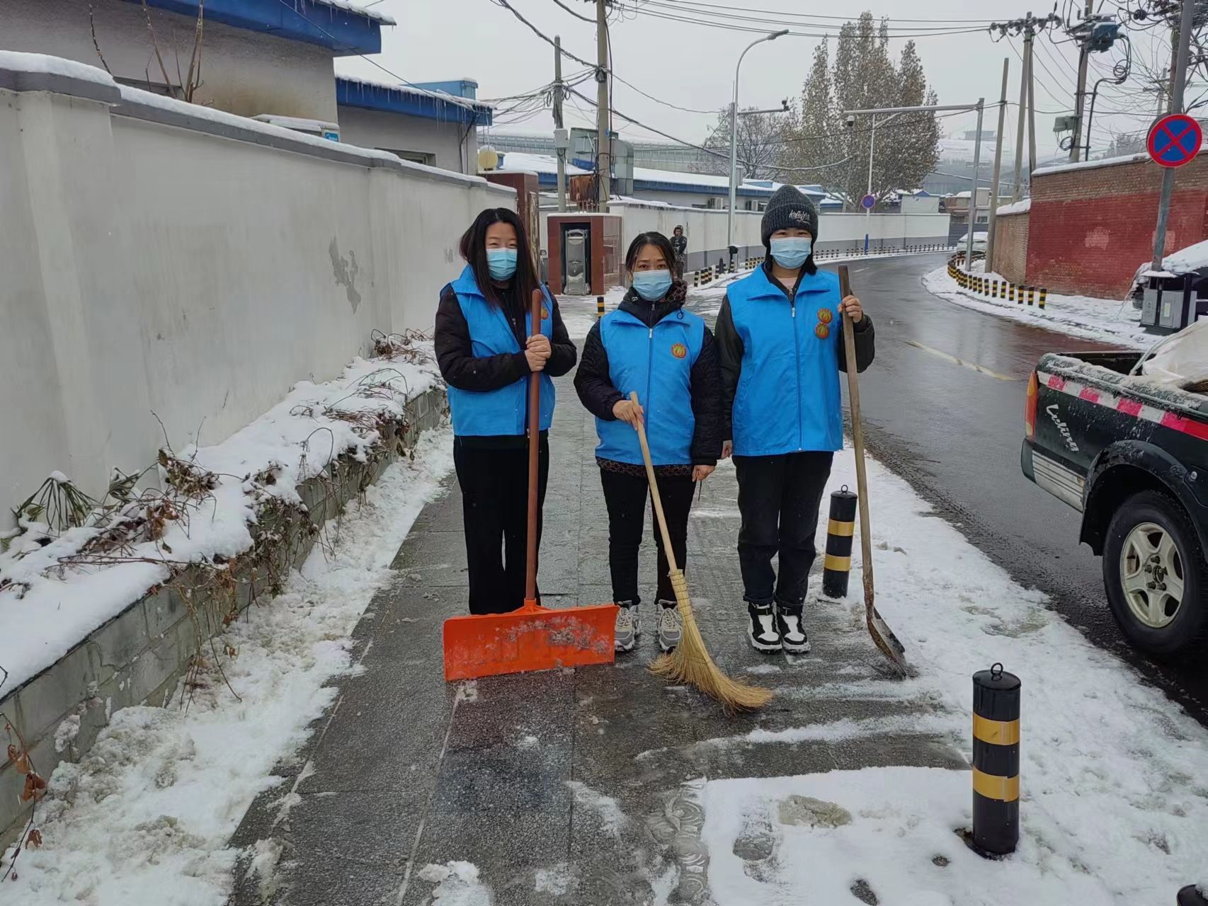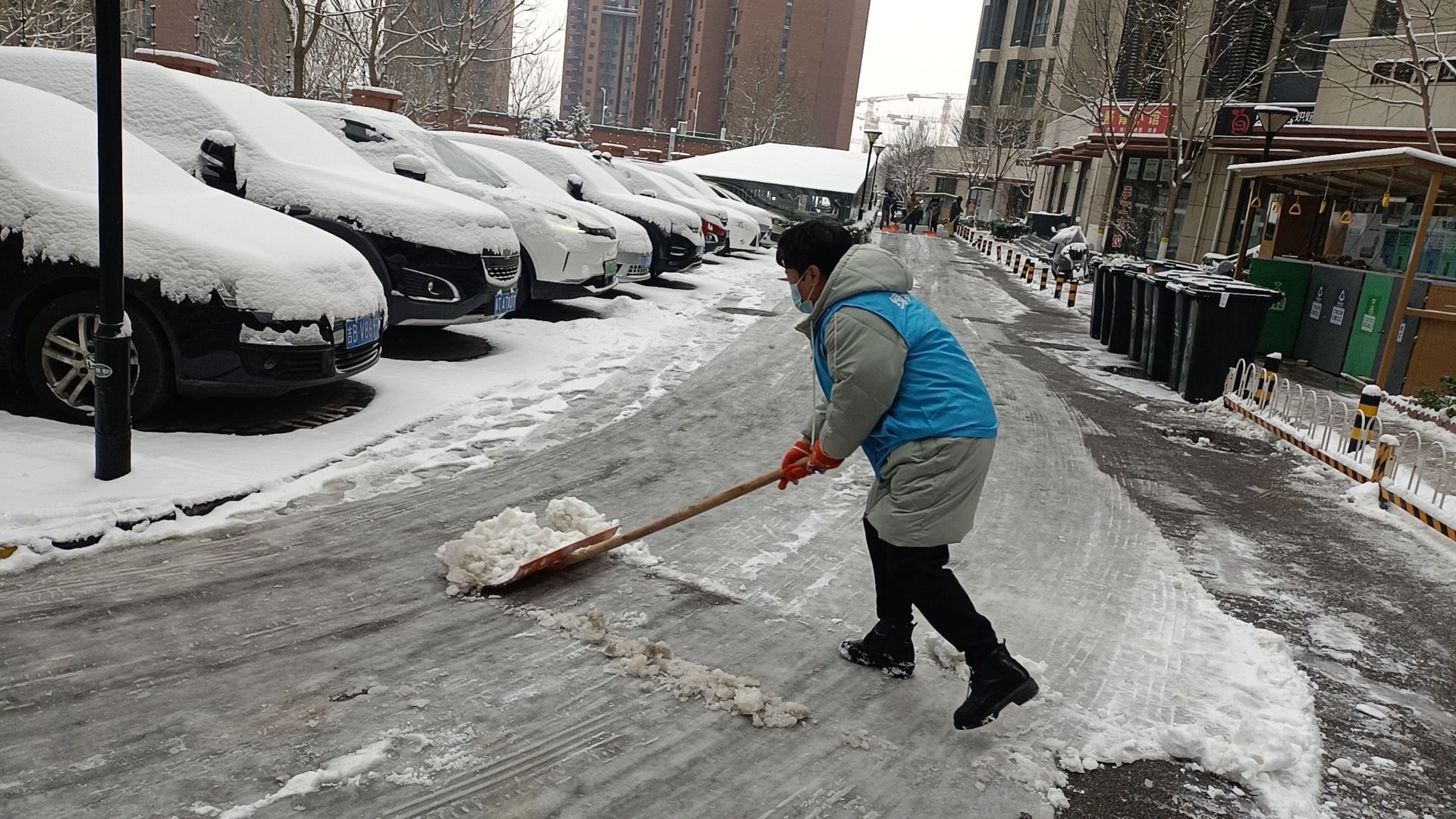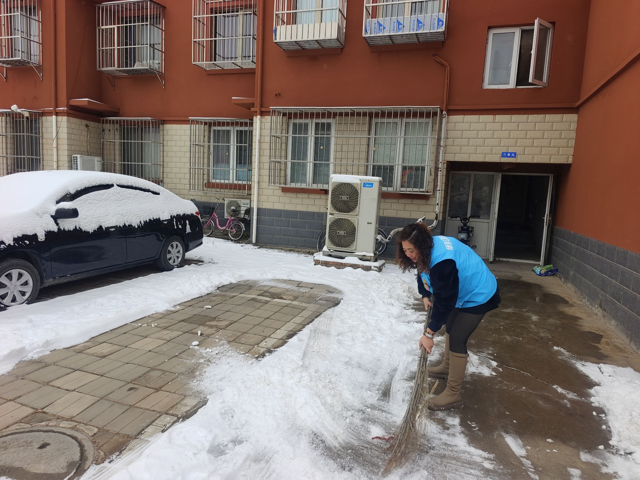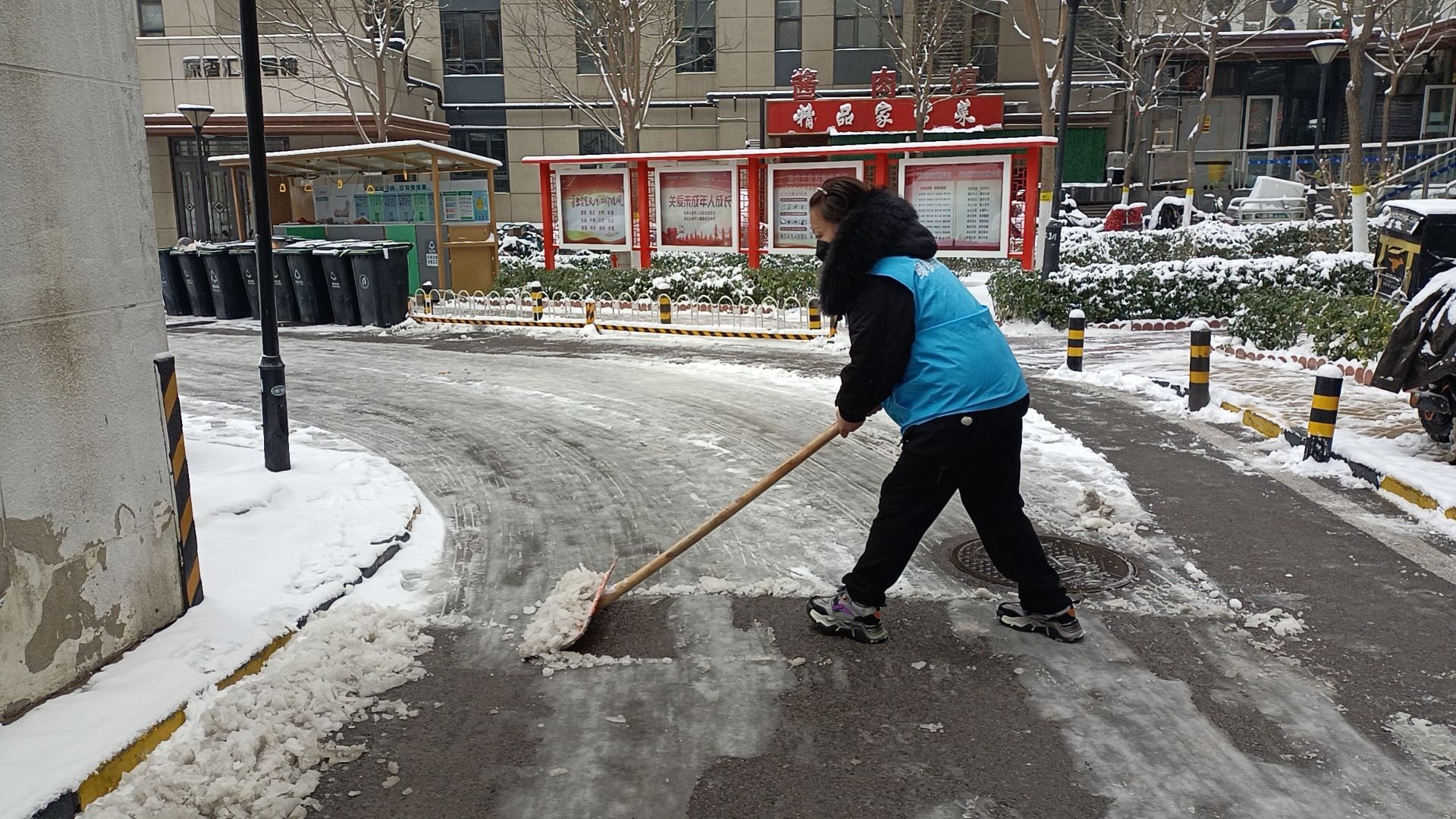 大雪把街道和社区装扮成一片银装素裹,但是美丽如画的雪景也带来了安全隐患。绿萝志愿者顶着大雪,不顾天冷路滑,手持扫把和铁锨等工具、团结协作,由于路面积雪厚重,尤其是随着气温骤降,路面结冰,增加了扫雪铲冰的难度。志愿者们先清除了主干道的积雪,又延伸清扫了人行道,团结一心保障了群众的安全出行,过路的行人纷纷点赞。