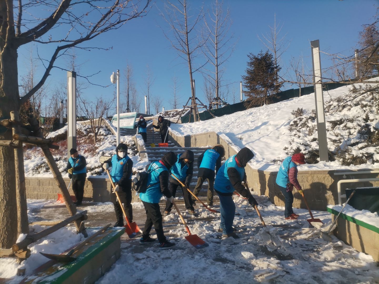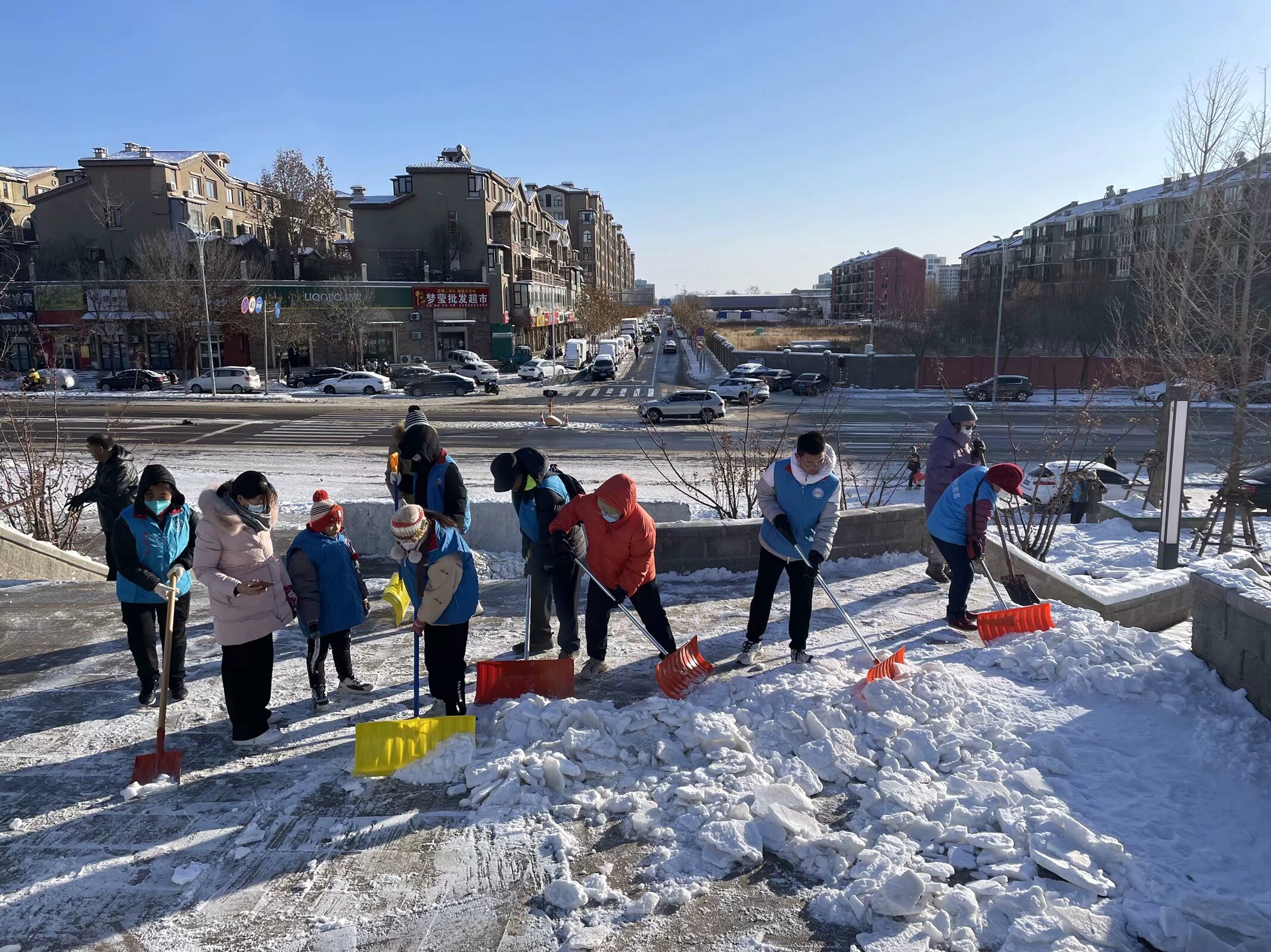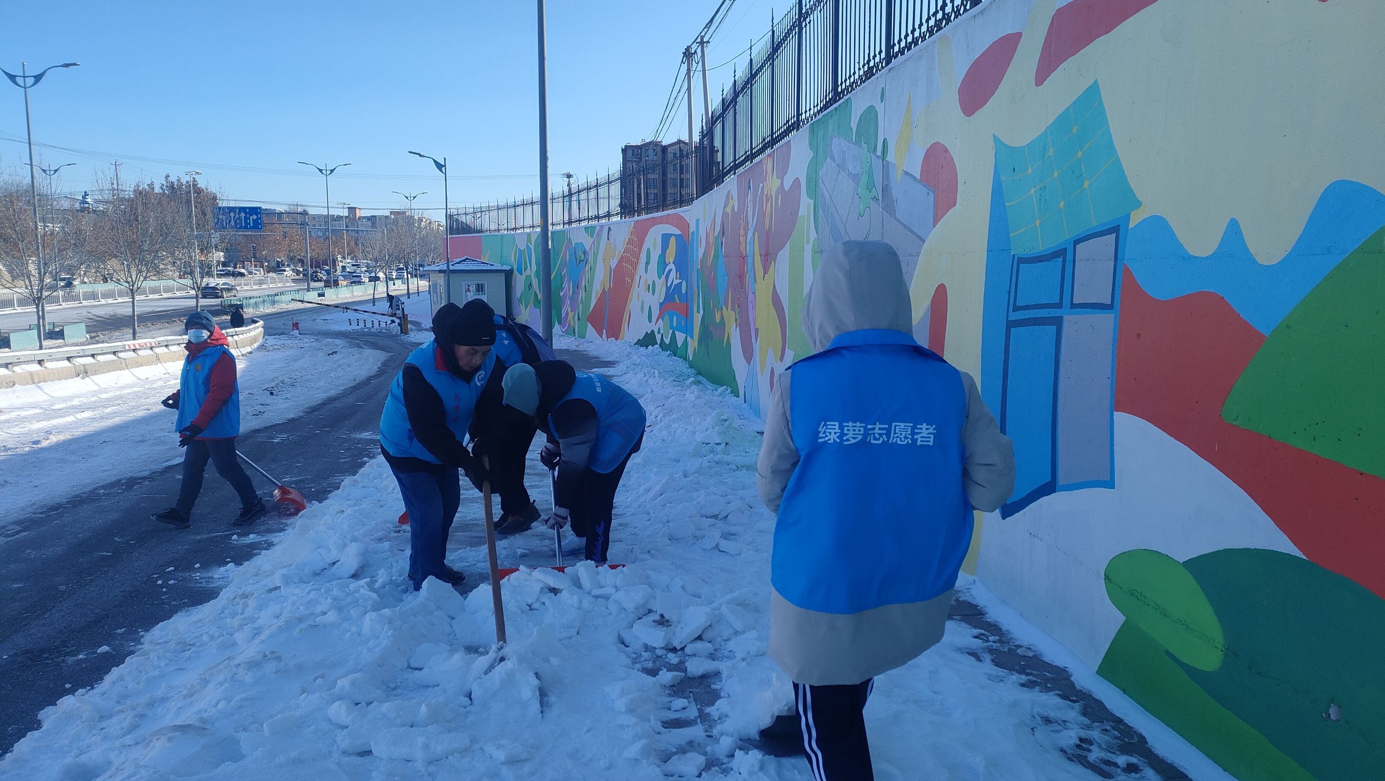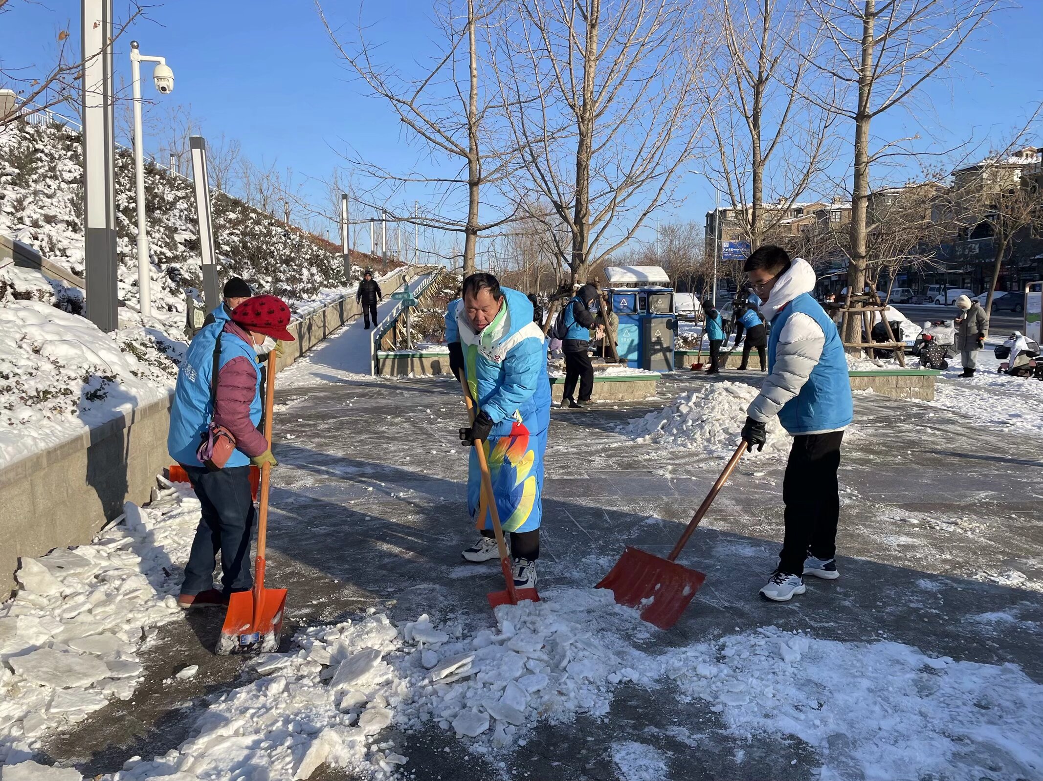 行动是最好的融雪剂。大雪过后的道路是最为寒冷和危险的,地面结冰,行动不便。绿萝志愿服务队充分调动党员先锋模范作用,不顾天冷路滑,手持扫把和铁锨等工具,沿着人行道一点一点的清扫路面的积雪。手套挡不住的是寒冷,寒冷挡不住的是热情,大家不断地铲、推、堆、运,为行人带来了安心与暖心,为居民群众清扫出一条条“平安路”。志愿者用实际行动折射出温暖人心的力量,让居民出行得到了改善,消除了安全隐患。