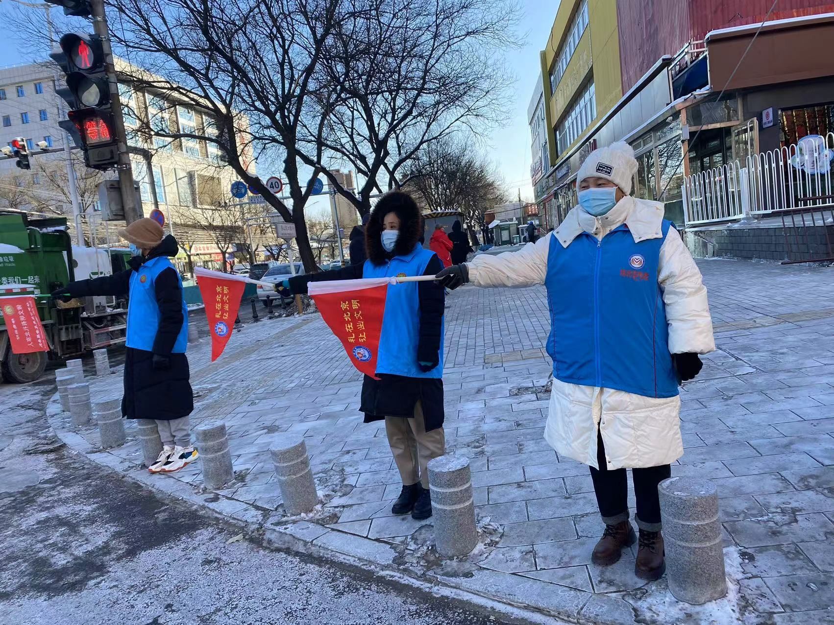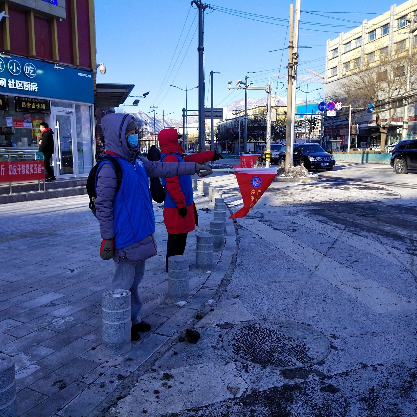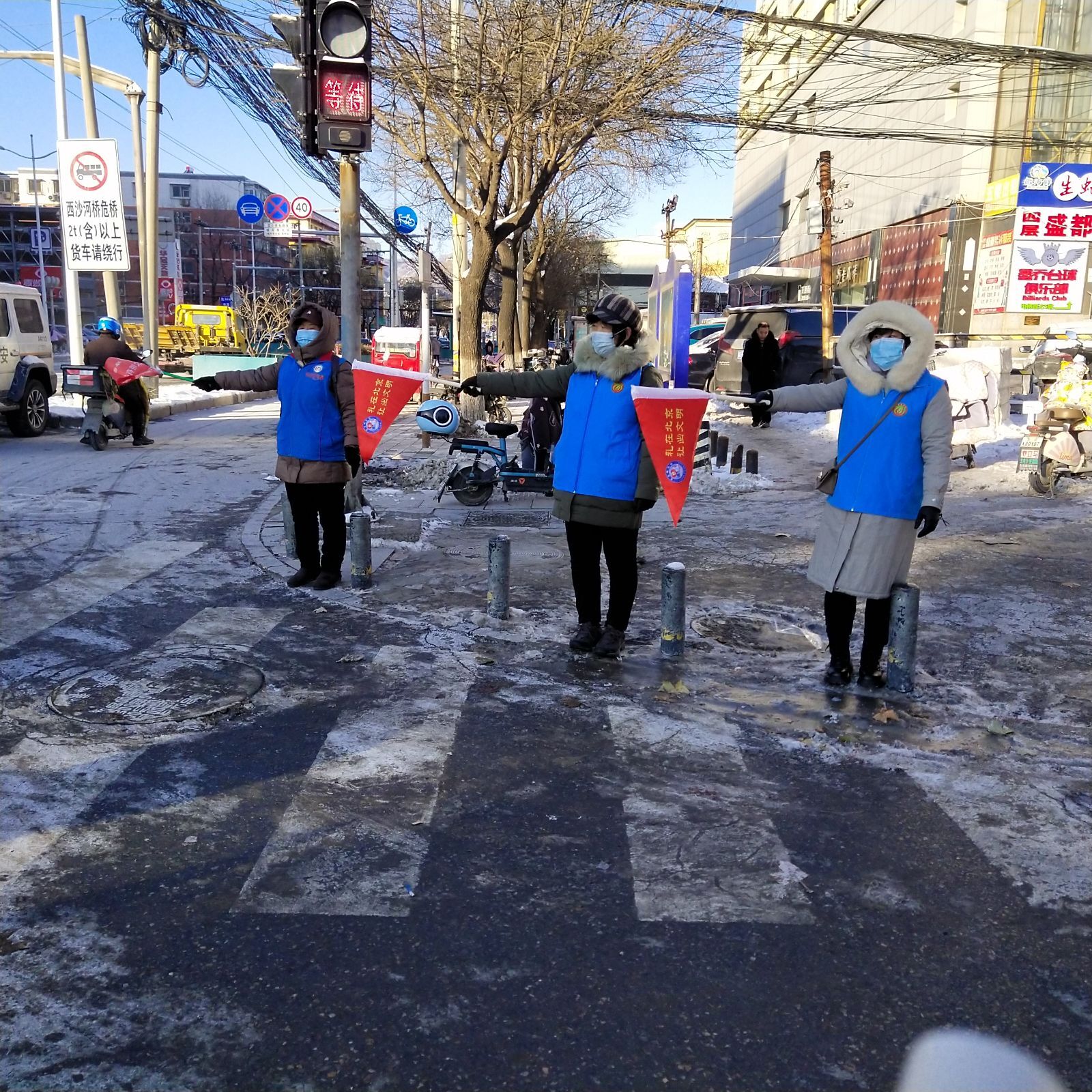 大雪过后的道路最为寒冷和危险的,地面结冰,交通出行有着很大的隐患。志愿者们早早的来到路口,用蓝色的身形和鲜艳的标志旗守护者十字路口的文明和安全。他们不仅提示行人注意信号灯的变化,还提示路滑慢行,不抢行、不急行,并提醒机动车及摩托车、电动车驾驶员过马路要注意红绿灯,要按照交通信号提示通过斑马线,真正使“斑马线”成为文明之线。