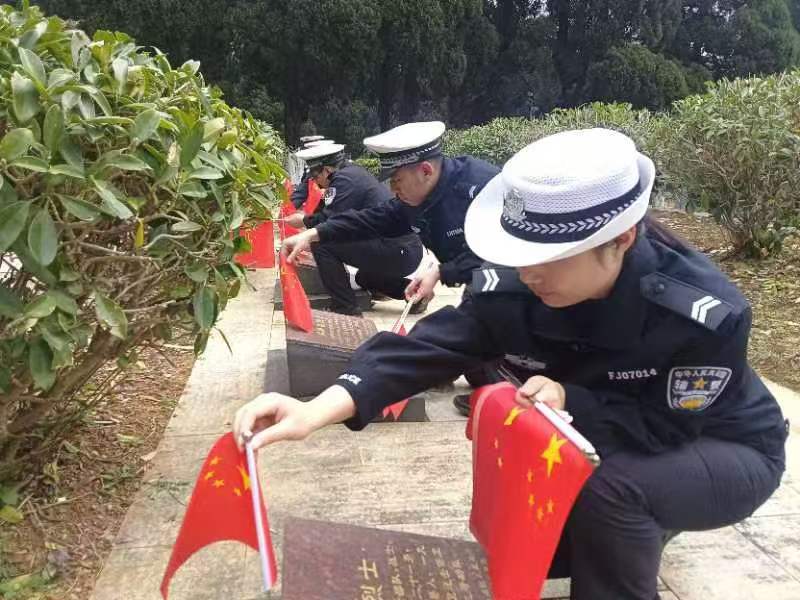 图为:靖西市公安局民警和义工一起协助老兵祭奠