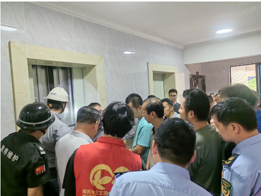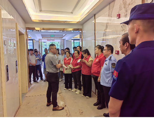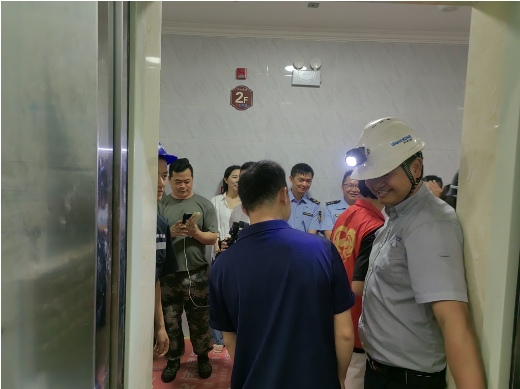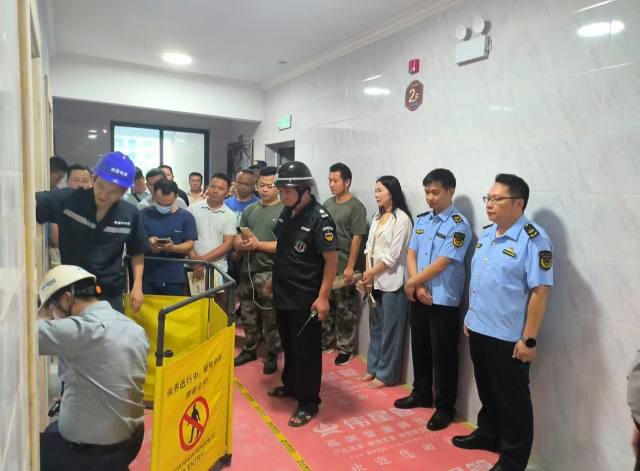 演练模拟小区住宅楼电梯突发故障,乘客被困的紧急场景。电梯使用单位迅速响应,立即启动应急预案,第一时间联系电梯维保单位开展救援。救援过程中,工作人员一方面细致排查设备故障,另一方面耐心安抚被困乘客情绪。最终,被困乘客被安全救出,整个救援过程紧张有序、处置高效。