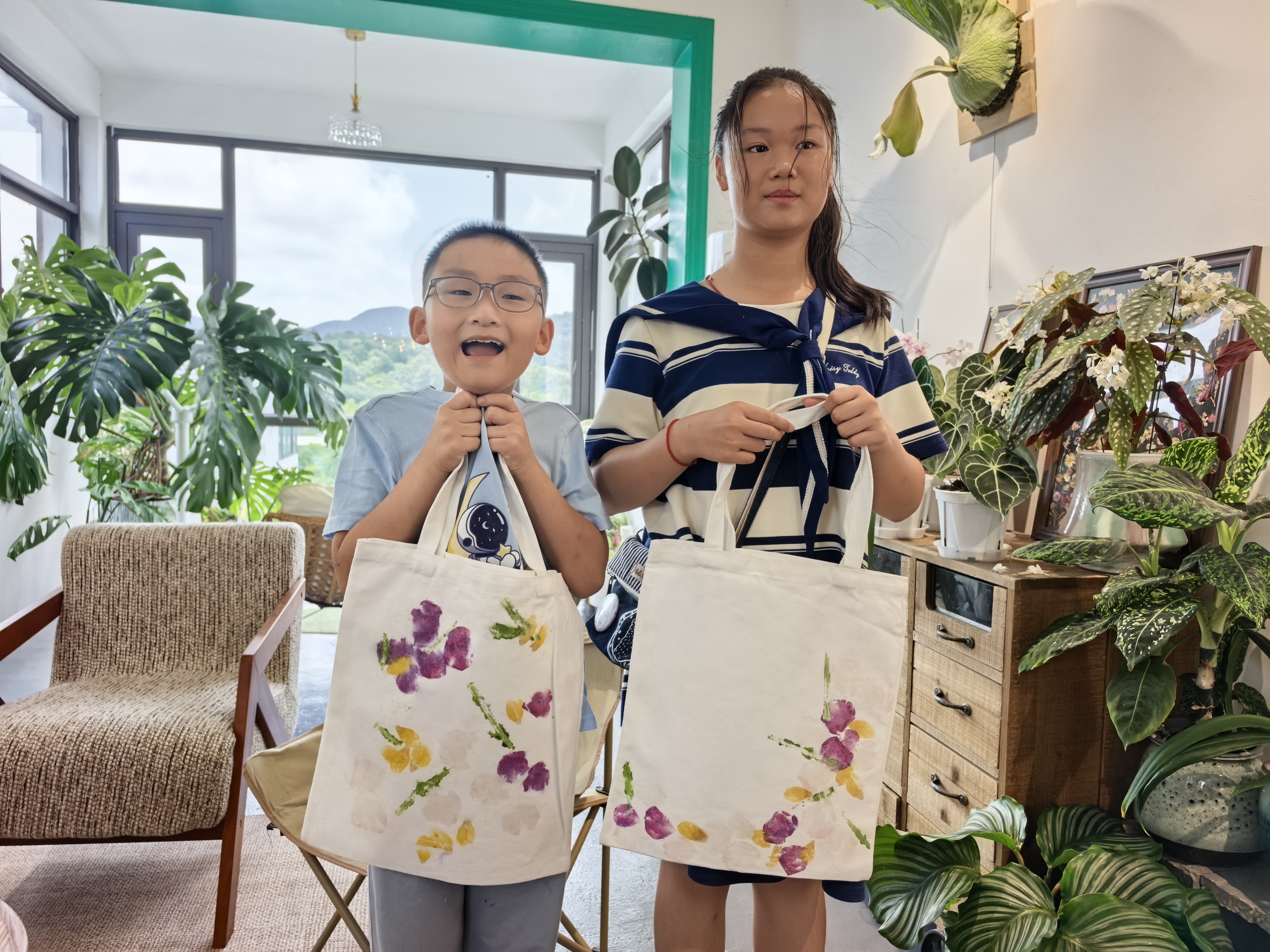 在寻觅绿意之后,最激动人心的创作环节到来。专业老师指导家长和孩子们将之前观察到的植物元素融入到帆布袋的创作中。通过敲击拓染技法,他们小心翼翼地将植物的色彩、脉络、形状“复制”到帆布袋上,每一个细节都充满了期待和惊喜。在创作过程中,家长和孩子们相互协作,共同完成了独一无二的森系美学原创作品。这些作品不仅承载着大自然的印记,更凝聚了亲子间的深厚情感与默契。