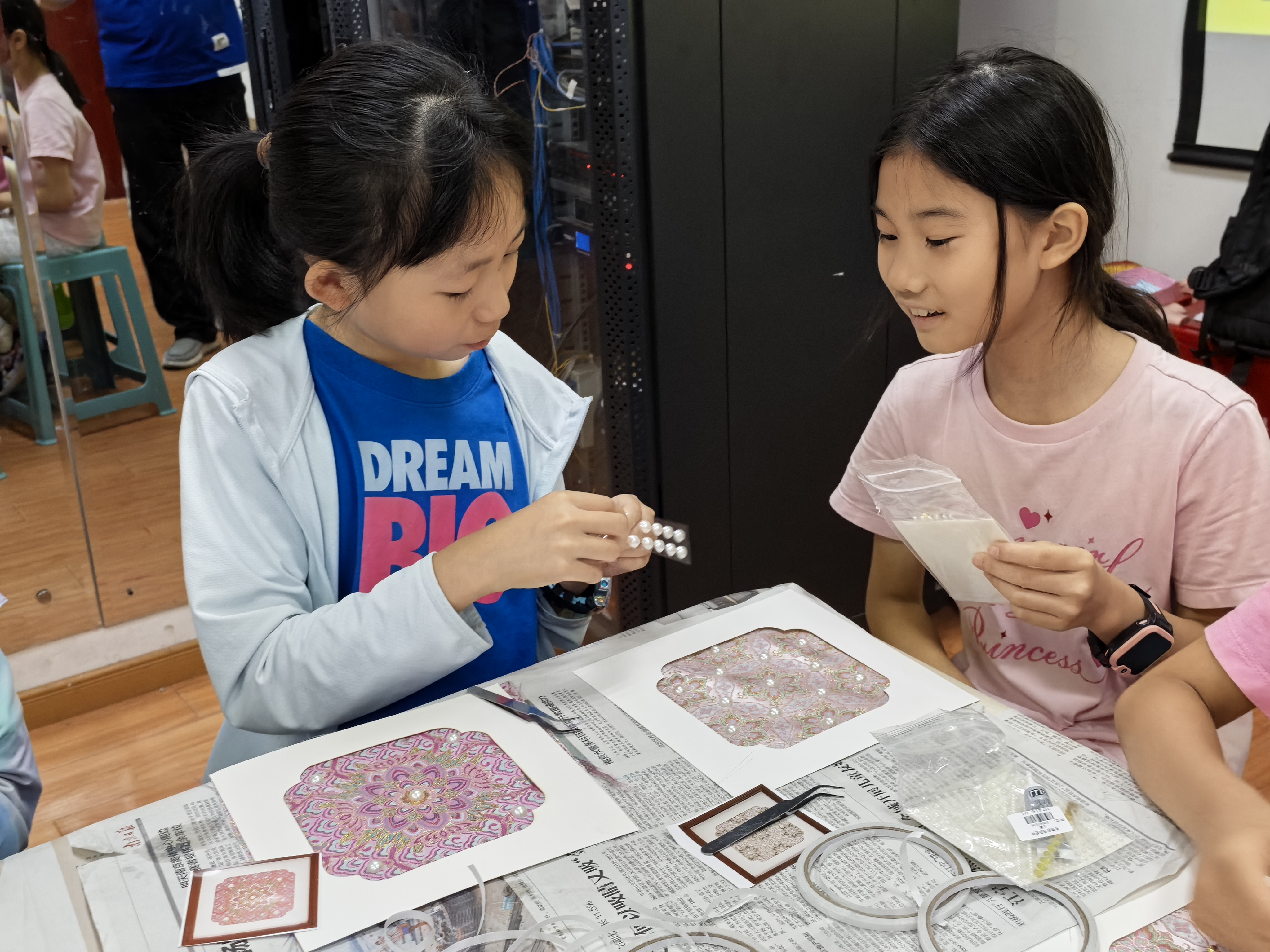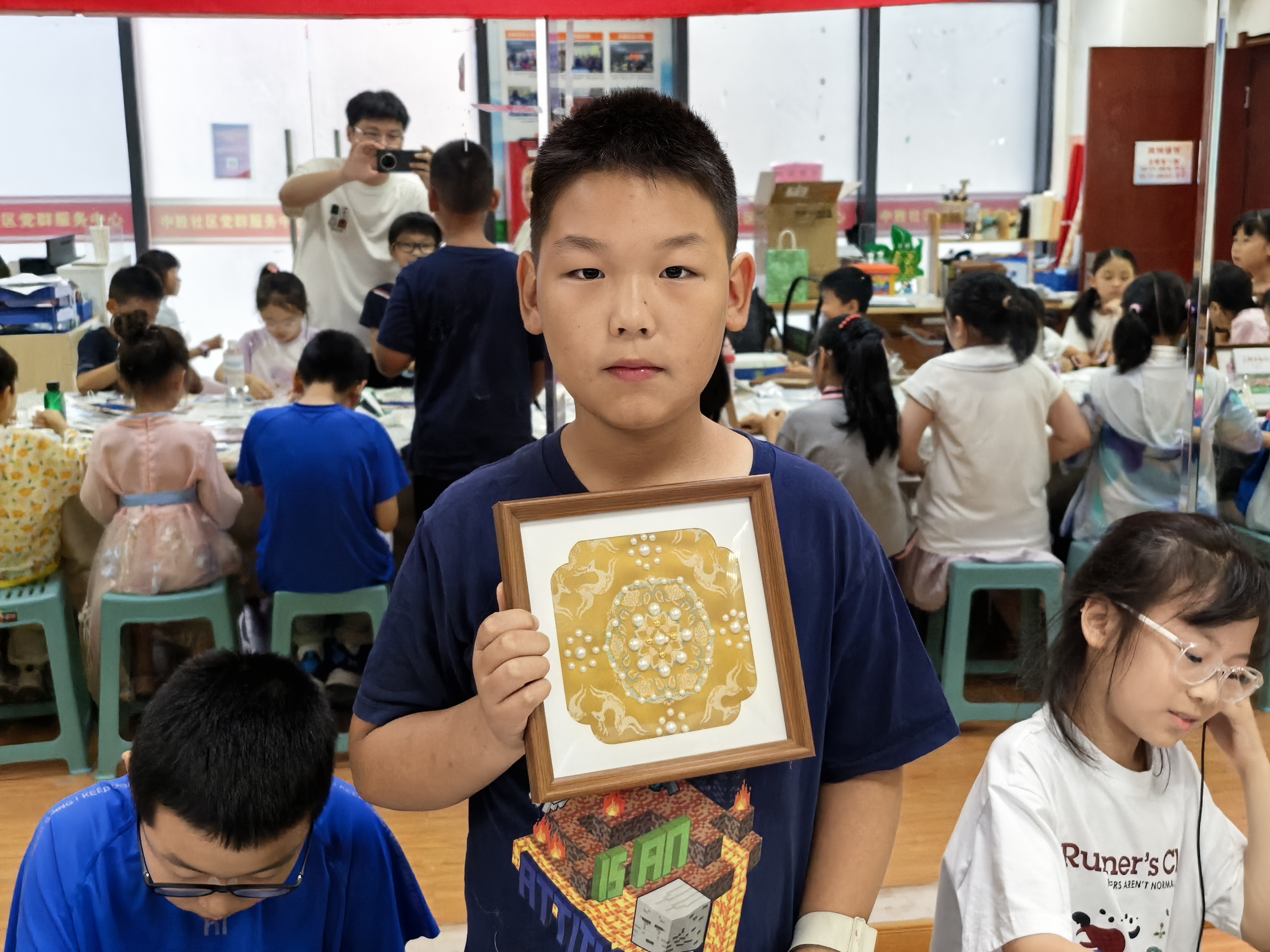 在欣赏了非遗宋锦的瑰宝后,青少年们迎来了动手创作的环节——制作宋锦珍珠画。他们小心翼翼地在宋锦的纹路上粘贴上璀璨的珍珠,每一颗珍珠都闪耀着孩子们对美的追求和对传统文化的热爱。完成后的作品被装裱在精美的画框中,成为了一份独一无二的艺术品,不仅展现了孩子们的创意和想象力,更是对传统文化的一种传承和创新。