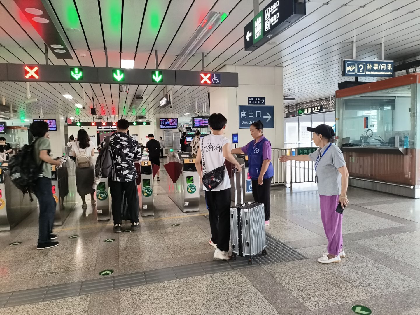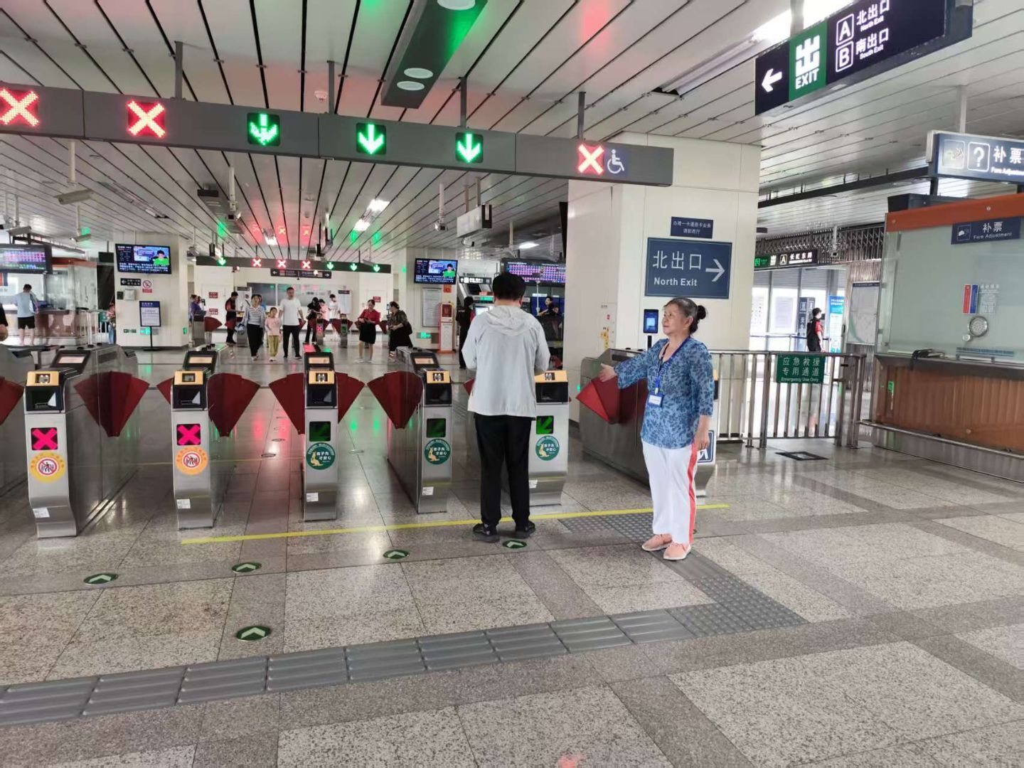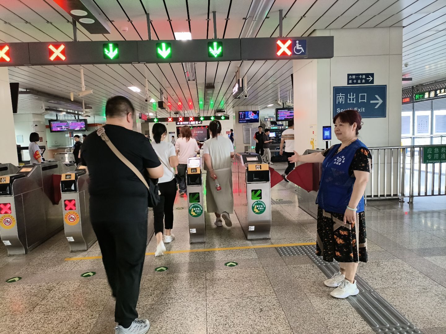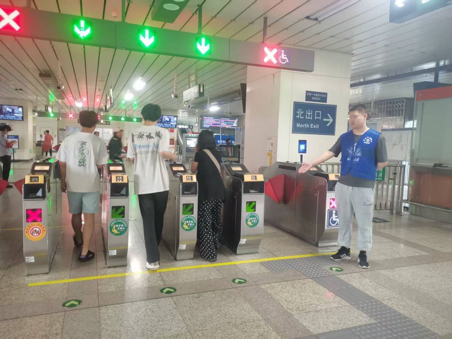 在闸机口前,志愿者们引导乘客有序通过,帮助不熟悉使用的乘客顺利进站出站。