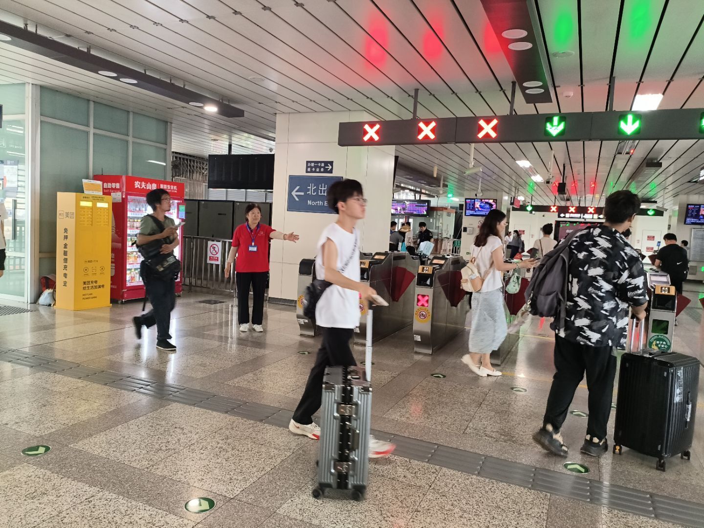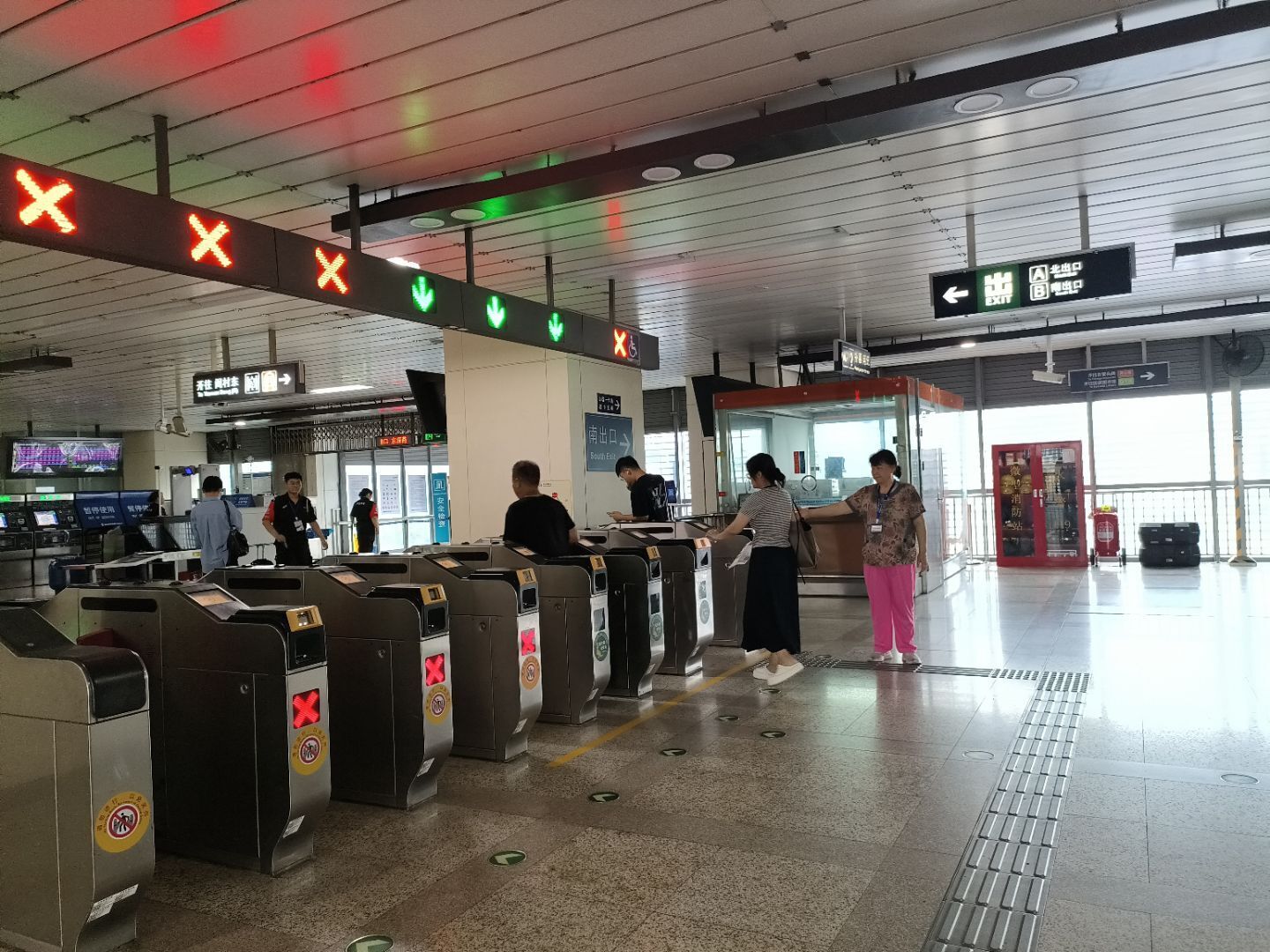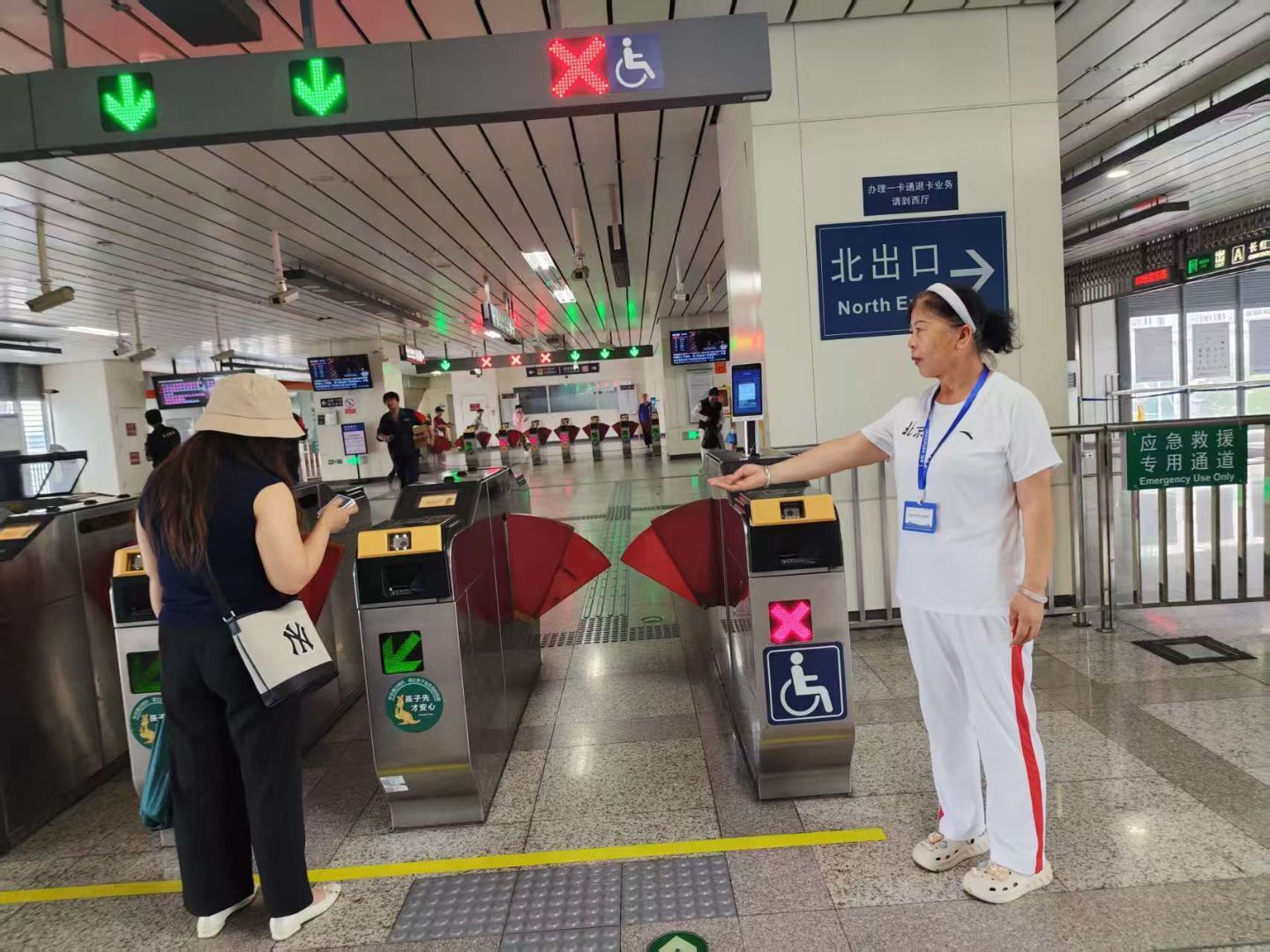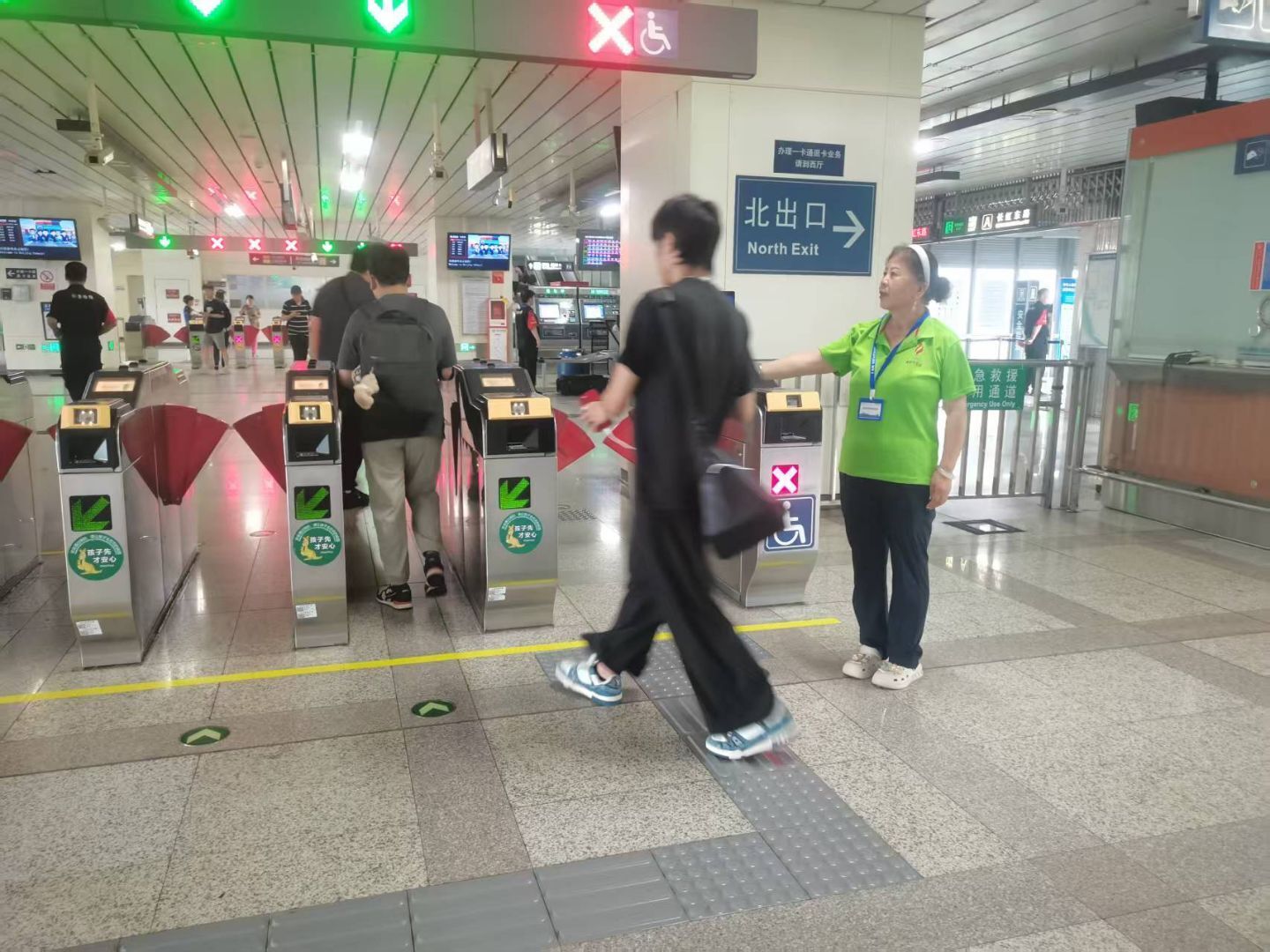 在闸机口前,志愿者们引导乘客有序通过,帮助不熟悉使用的乘客顺利进站出站。